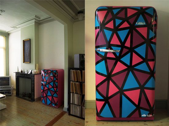 - Les appareils de cuisine peuvent être peints non pas d'une seule couleur, mais en ajoutant des rayures multicolores ou des formes géométriques.Dans le même temps, il est pratique d'utiliser du ruban de masquage au niveau des transitions de couleurs pour un résultat plus précis.