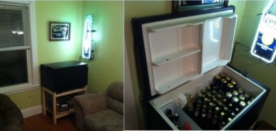- Réfrigérateur. Une armoire entièrement prête à l'emploi pour ranger des livres, des canettes et des céréales. Les grilles sont transformées en supports pour affiches et photographies.