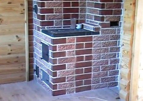 De plus, lors de l'installation d'un poêle de sauna avec un foyer externe, il convient de laisser de l'espace jusqu'au canal télescopique. La rangée supérieure de briques est disposée à votre guise, vous pouvez la pousser un peu pour créer une étagère.