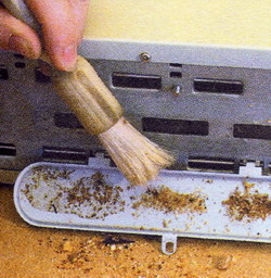 Selon la fréquence d'utilisation, des miettes s'accumulent dans le boîtier, pour cela vous devez le mettre sur le côté et utiliser la même brosse pour les balayer soigneusement de l'intérieur du grille-pain.