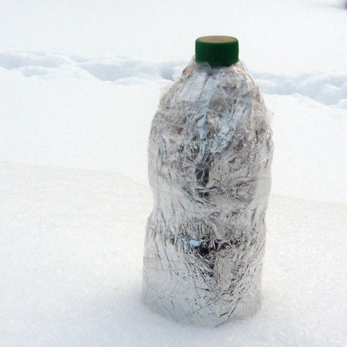 Disons que vous n'avez qu'une bouteille de 0,5 litre. Enveloppez-le dans du papier d'aluminium. Nous enfilons deux chaussettes en duvet ou les enveloppons dans une écharpe en laine. Nous mettons un sac en plastique noir et le recouvrons de ruban adhésif. Le résultat sera un thermos de la série « mieux que rien ».