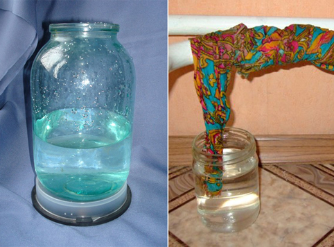 - Réalisez une découpe sur le côté de la bouteille sur toute sa longueur, environ 10X2 cm, en forme de fenêtre rectangulaire. La structure est suspendue sous une section horizontale droite du tuyau de chauffage à 10 à 20 centimètres de celui-ci. L'eau est versée dans la bouteille. On découpe une bande de gaze d'environ 10 cm de large et un mètre de long dont l'extrémité est descendue dans la fenêtre découpée. La gaze est enroulée autour du tuyau et le processus commence. Les avantages de la méthode sont la simplicité et le faible coût de l'appareil, l'inconvénient est une faible productivité due à l'évaporation directe de l'eau sans pulvérisation.