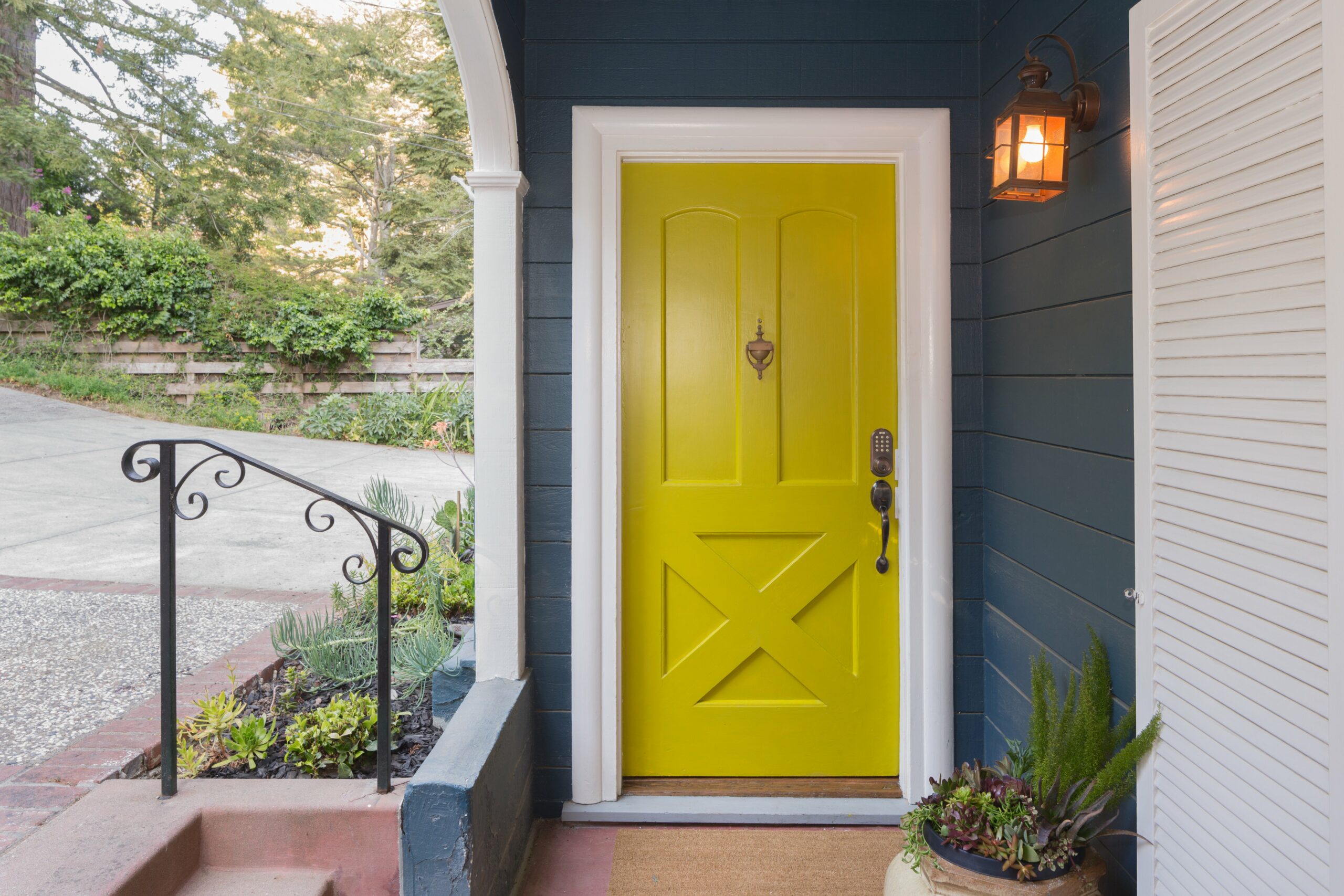 Si vous vivez dans une maison privée, la porte d'entrée est la première chose sur laquelle vous devez vous concentrer. Il peut être de couleurs complètement différentes et imprévisibles, ce qui ne fera qu'ajouter de l'insolite et de l'originalité à la maison. Les portes d'entrée sont superbes dans une riche teinte verte, bordeaux, bleu vif ou même vert clair, framboise ou orange.