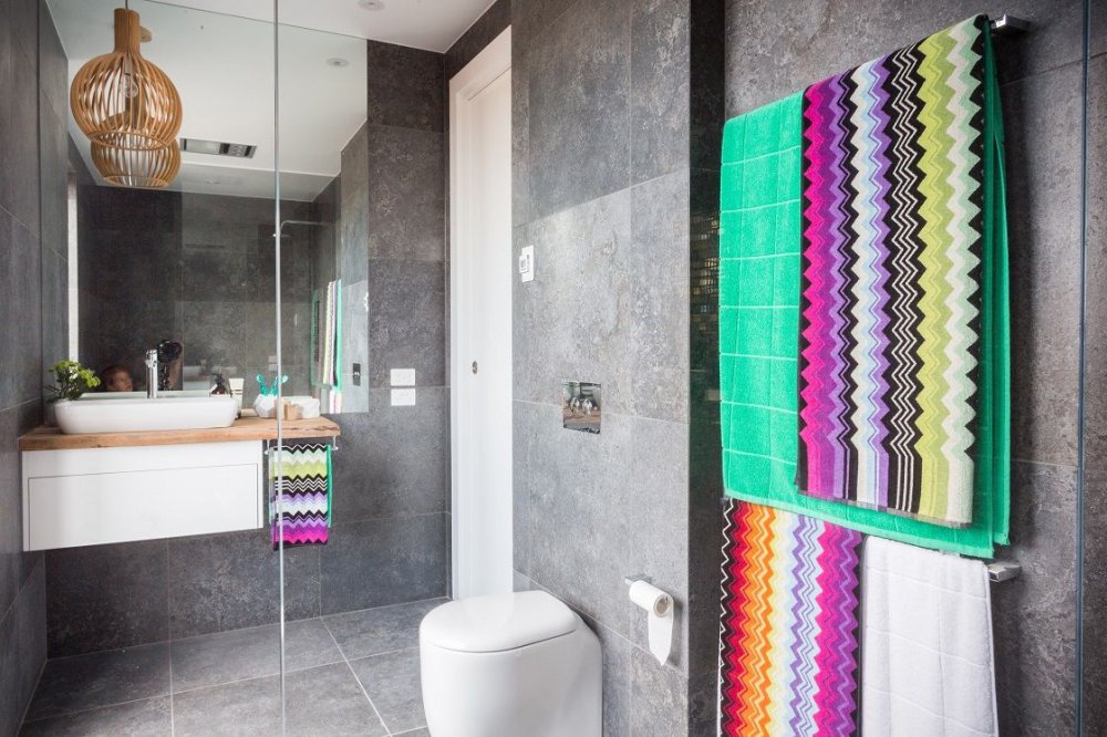Encore une fois, beaucoup préfèrent le design classique de la salle de bain - des nuances claires, un minimum de motifs et d'imprimés, des combinaisons neutres et aucune décision audacieuse. Mais si vous voulez vraiment ajouter de la couleur à cette pièce, alors la meilleure solution est d'acheter des textiles clairs. Les serviettes aux couleurs profondes sont idéales pour la salle de bain : prune, violet, indigo, herbe.