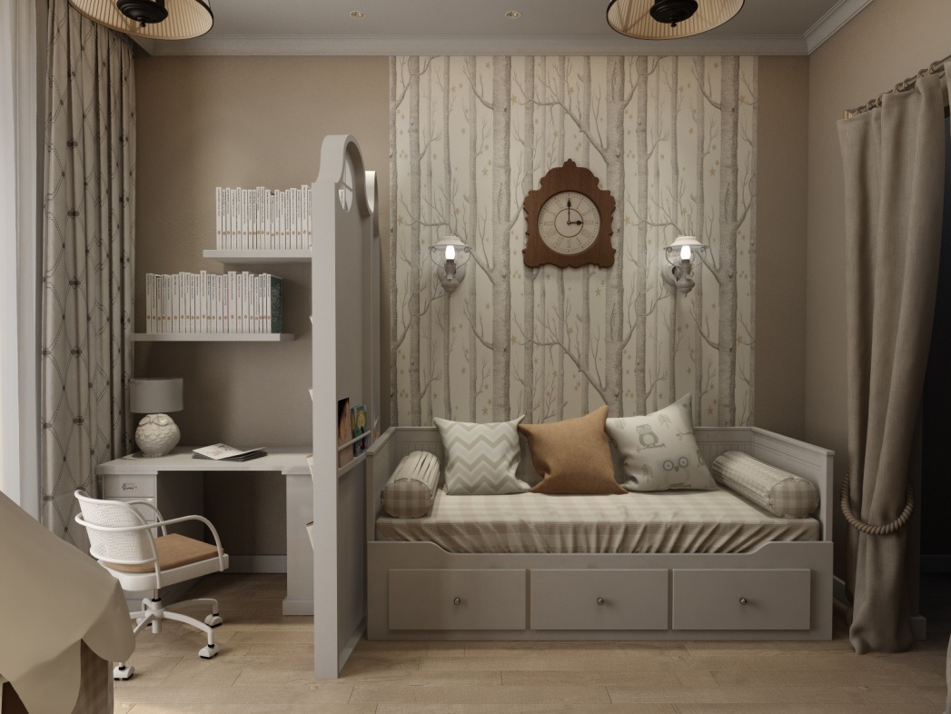 Cependant, pour une chambre d’enfant, il est permis d’utiliser des tons colorés et, dans certains cas, pastels. Pour adhérer aux principes de cette direction, vous pouvez utiliser deux ou trois couleurs à l'intérieur, jouer avec les contrastes et ajouter des éléments métalliques. Ainsi, une combinaison de beige et de chocolat est parfaite pour les garçons, et de blanc et de rose pour les filles.