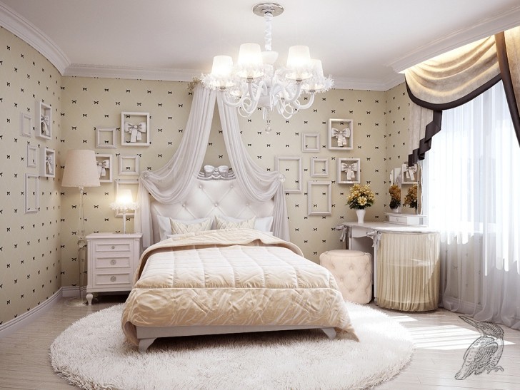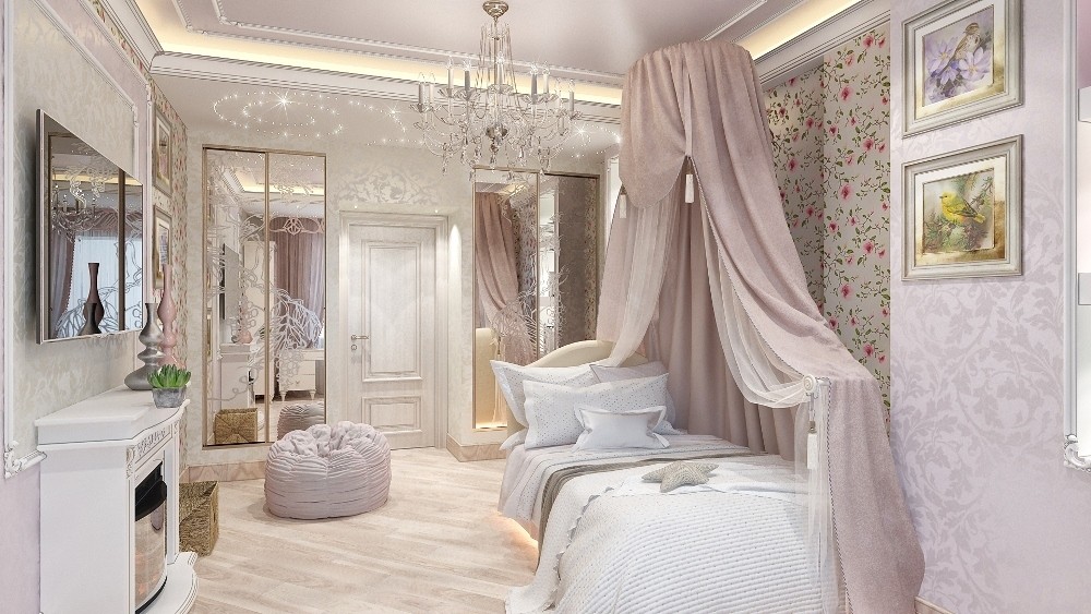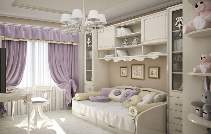 Lors de la décoration d'une pièce, n'oubliez pas que dans un espace délicat et en apesanteur, il ne faut pas jouer avec les contrastes avec zèle et surcharger la chambre de bébé d'une abondance de dessins. La pièce est décorée uniquement par la texture : le motif n'est pas particulièrement frappant, mais est présent - sur les rideaux, les meubles, le papier peint, les accessoires. C'est grâce à l'ornement en dentelle que se crée l'impression d'un intérieur ajouré et élégant, mais il est important qu'il s'intègre harmonieusement dans le décor.