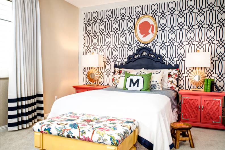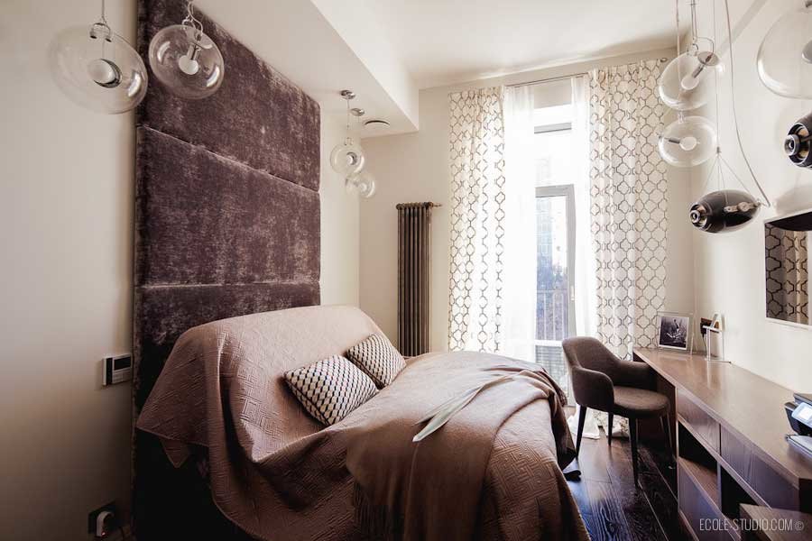 N'ayez pas peur d'expérimenter et d'ajouter des solutions audacieuses. Par exemple, tous les murs peuvent être peints dans une teinte calme et la surface derrière le lit peut être décorée de manière plus lumineuse et plus efficace.