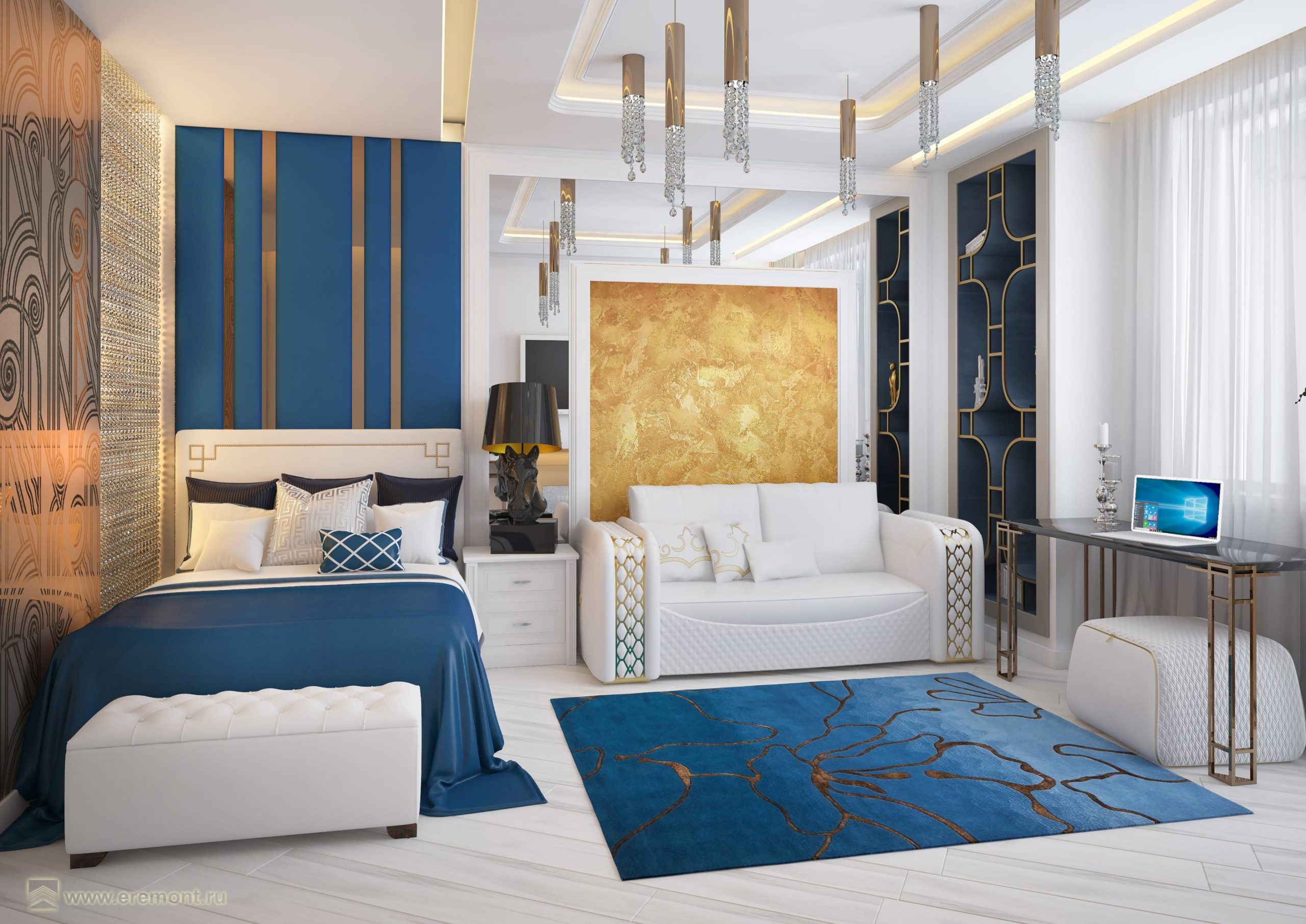 Les teintes principales sont calmes, associées aux contrastes et aux dorures.La pièce est décorée dans une palette neutre mais stricte. Les plus populaires sont le noir et blanc. L'or, le bronze et l'acier sont utilisés comme accents.