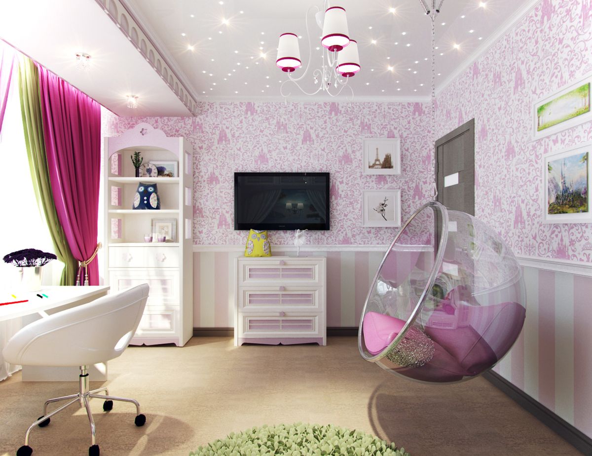 La présence de brillant est un atout incontestable dans la conception d'une chambre d'enfant. Les façades de meubles peuvent être recouvertes de miroirs, des carreaux de miroir et d'autres éléments similaires sont utilisés.