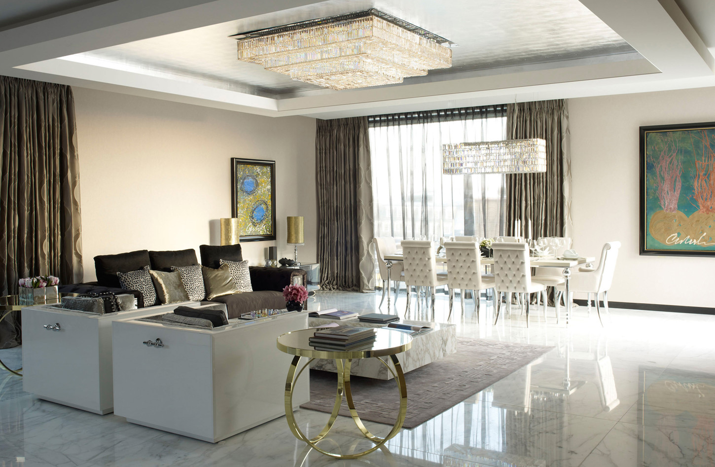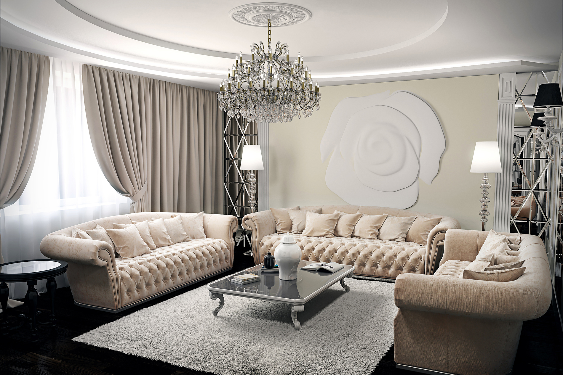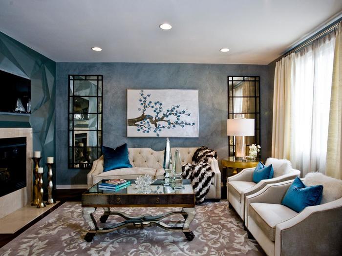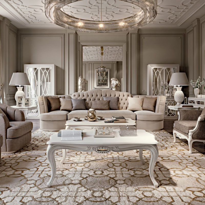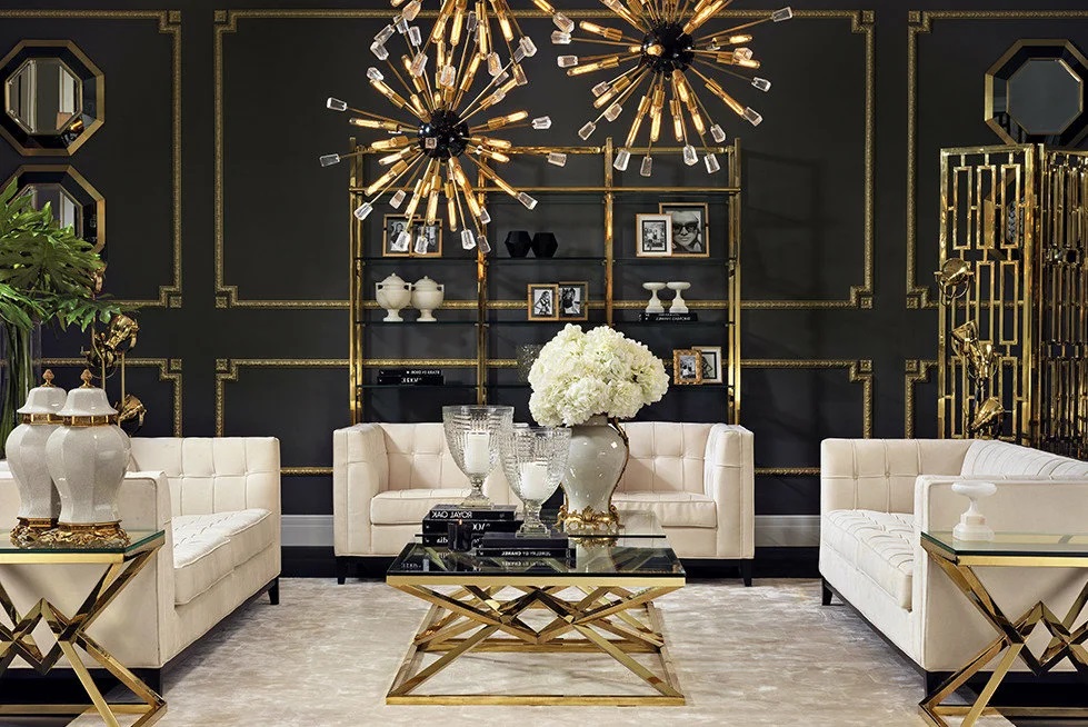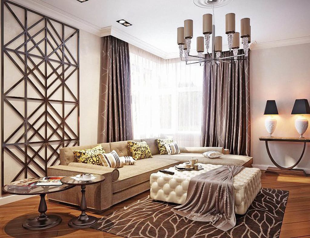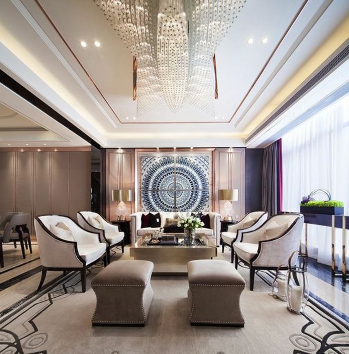 Lors de l'aménagement d'une pièce, ne disposez pas les meubles comme d'habitude - le long des murs. L'Art Déco préfère les espaces joliment décorés. Ils doivent être séparés. Plus précisément, l’agencement doit commencer par le centre du salon. Tout d'abord, une table basse est placée, puis des compositions de fauteuils et d'un canapé sont construites autour d'elle.