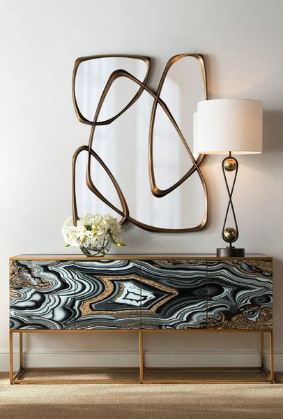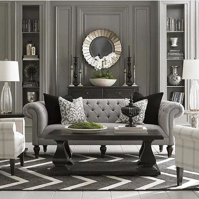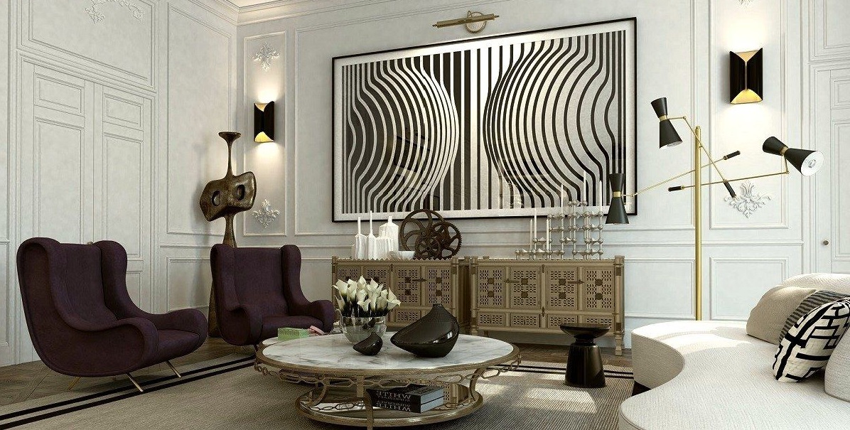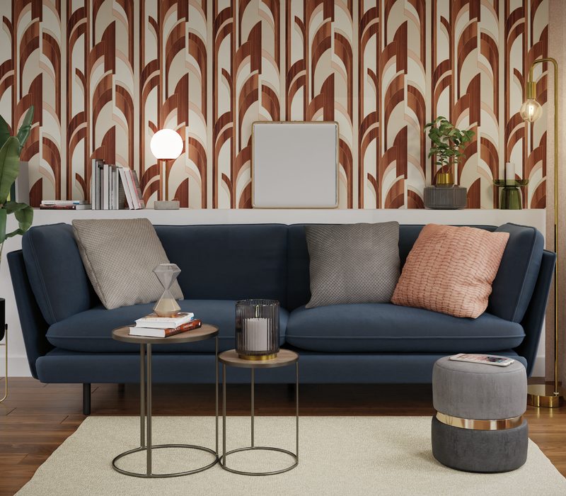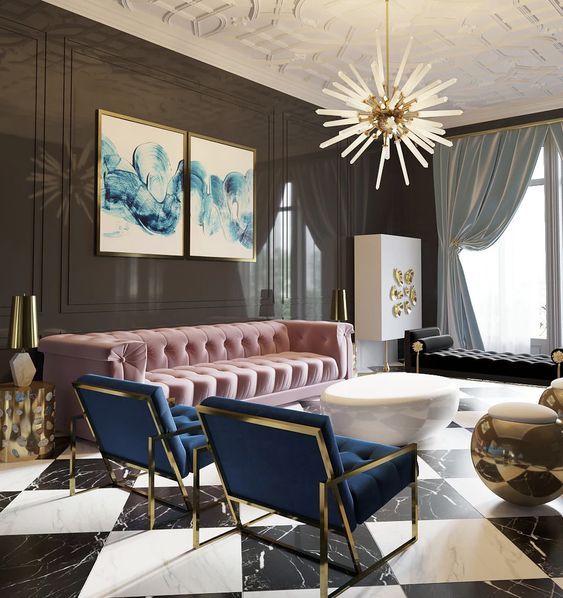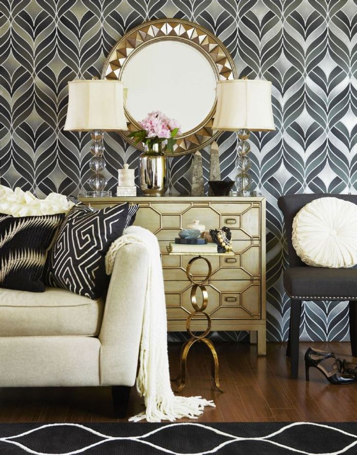 Le design de salon Art Déco est synonyme d’angularité, de lignes épurées et d’arêtes vives. Lors de la décoration d'une pièce, choisissez une géométrie symétrique - trapèzes, zigzags, losanges et carrés. Le motif sunburst incarne le style Art déco avec ses transitions nettes et ses traits irréguliers.