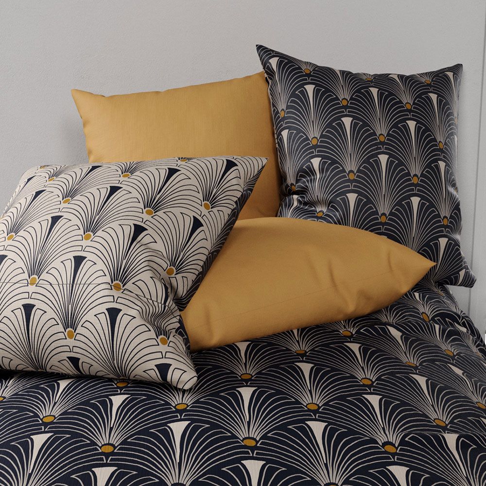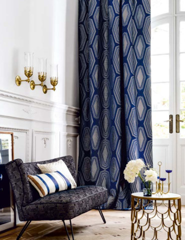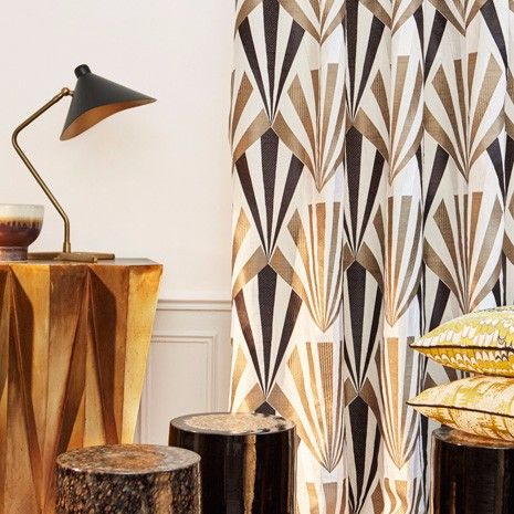 Ce style se caractérise par l'utilisation généralisée de produits textiles. La pièce doit avoir des rideaux en tissu classiques, des draperies variées et des tissus d'ameublement exquis. Grâce à ce style, les abat-jour en coton et en lin pour lampadaires et lampes de table sur une base en bronze durable sont devenus populaires. Les motifs courants utilisés sur les tissus sont les plumes de paon, la géométrie et les touches florales stylisées.