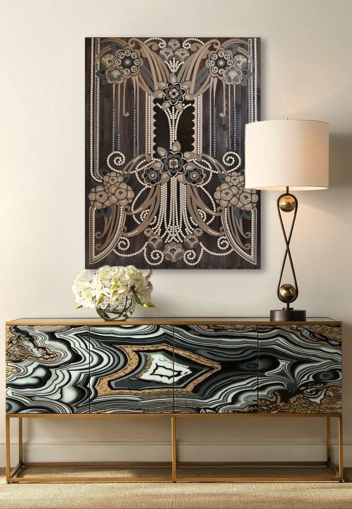 Les matériaux luxueux utilisés dans le style Art déco créent l’ambiance de toute la pièce. Il s'agit de pierres naturelles, de revêtements laqués et de nacre, de surfaces en verre et en métal, de bois précieux, d'ivoire et de cuir véritable.