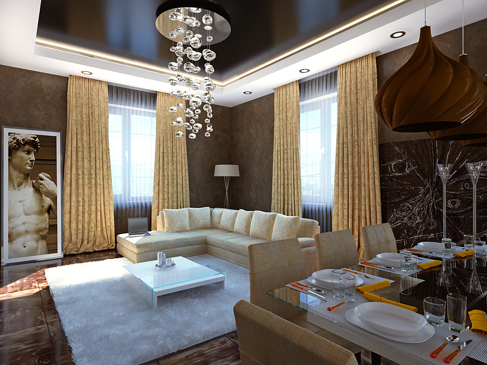 La surface peut être plane ou à plusieurs niveaux. Ils le décorent de spots intégrés ou de fines bordures en stuc sur le pourtour du salon.