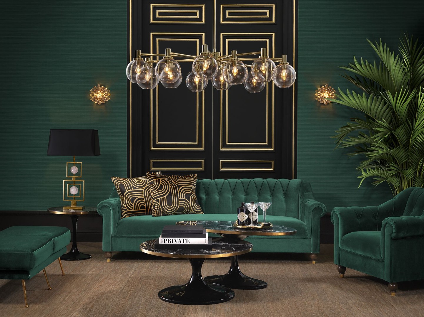 N'oubliez pas les petites choses insignifiantes (à première vue) qui ajouteront une énergie particulière à l'ambiance art déco.Incluez un meuble de bar glamour, un chariot à cocktails ou un buffet, une chaise longue ou des lits de repos.