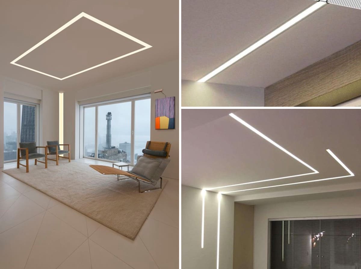 Le secret réside dans le profilé en aluminium situé sous la toile tendue. Une bande LED y est insérée, qui a différentes longueurs, largeurs et formes. Le propriétaire des lieux a la possibilité d'imaginer ses propres ornements qui les maîtres composeront du ruban lumineux.