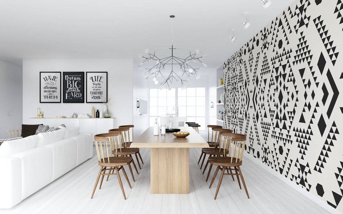 Le papier peint contient des images et des imprimés modernes et ethniques qui complètent avec style l'environnement. Souvent utilisé motifs géométriques simples. Ils s'intègrent de manière colorée à l'intérieur, surtout s'ils correspondent aux couleurs du mobilier de la pièce.