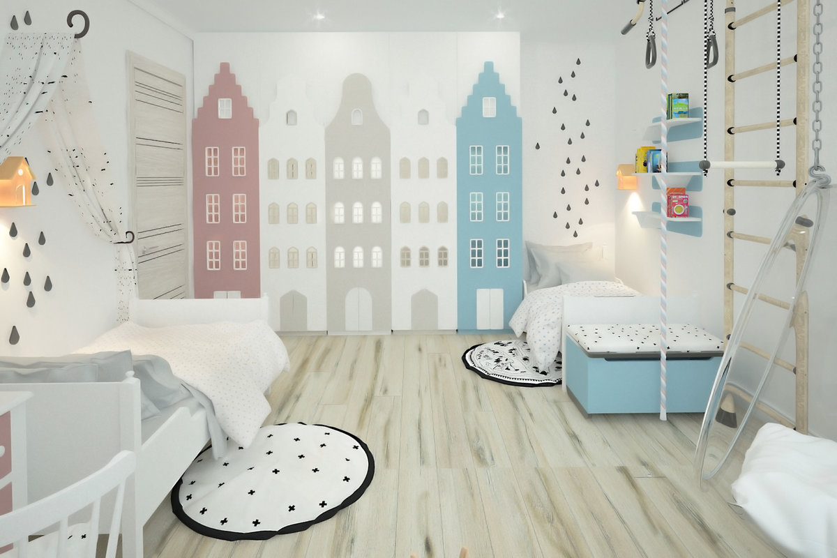 Les nuances claires constitueront une excellente toile de fond pour un espace de couchage ou une aire de jeux dans une chambre d'enfant.