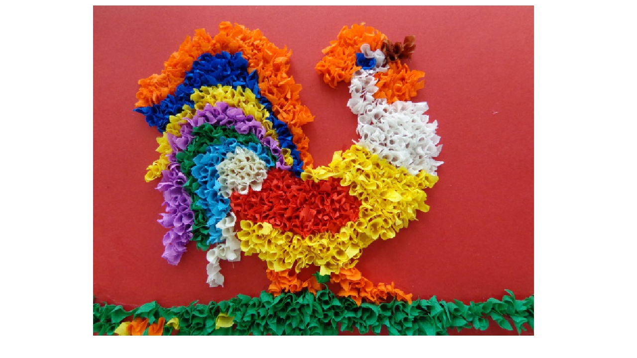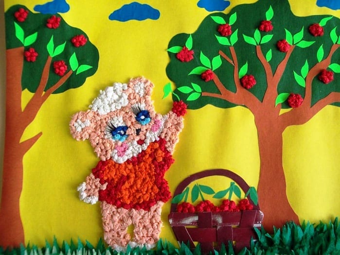Vous pouvez utiliser n'importe quoi comme idée : des animaux, des insectes, des oiseaux, des plantes, une maison, des fleurs et bien plus encore. Pour commencer, il vaut mieux réfléchir à un schéma simple pour que le bébé comprenne comment agir. Avec l'expérience, la complexité peut être augmentée et des options de mise en œuvre plus complexes peuvent être proposées, nécessitant de la précision et l'utilisation de plusieurs nuances de serviettes.