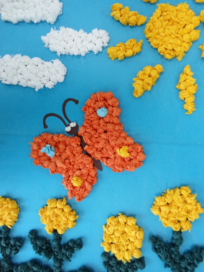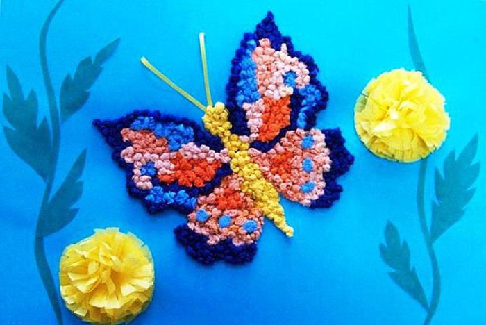 Par exemple, vous souhaitez créer un papillon avec votre bébé. Pour ce faire, vous devez le dessiner sur du carton en soulignant tous les détails.Ensuite, prenez une serviette d'une certaine couleur, arrachez-en un petit morceau, roulez-la en boule et collez-la à la base dans la zone qui doit être remplie d'une couleur spécifique. Et c’est ainsi que chaque détail du papillon est élaboré.