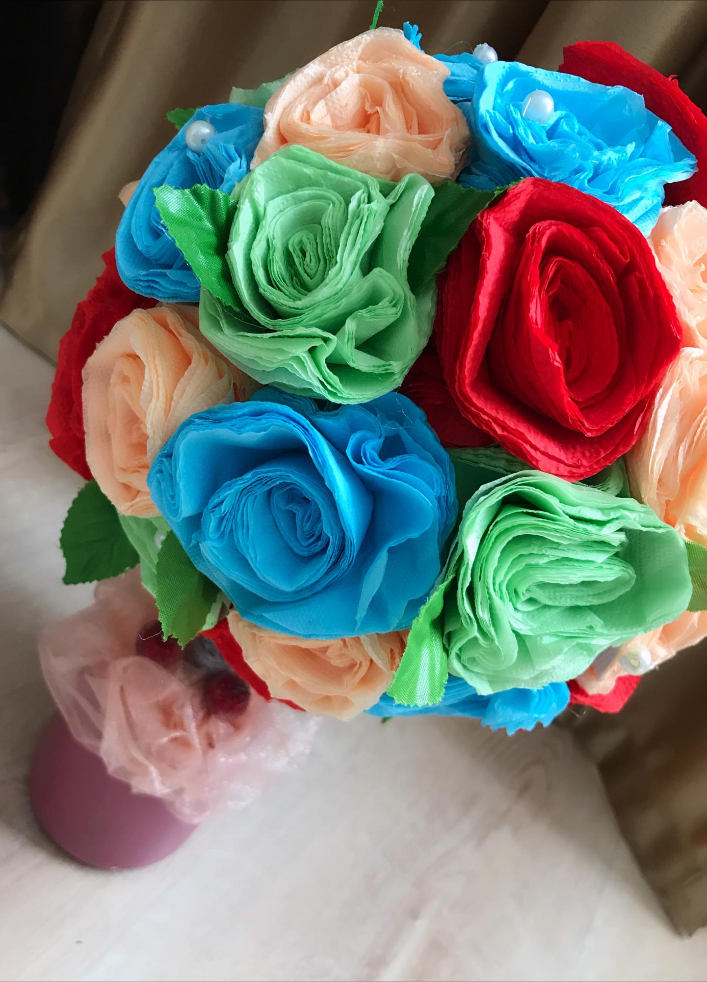 - Formez un bourgeon en soulevant les bords de chaque couche. Vous devez fabriquer environ 45 de ces pièces dans différentes couleurs. Plus il y a de nuances, plus le résultat final est lumineux.
