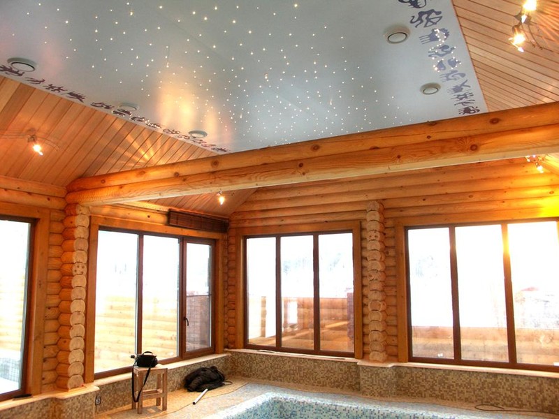 Finition décorative classique. Les plafonds des maisons en bois naturel sont ourlés de doublure. Le revêtement final est appliqué avec un vernis ou une peinture légère qui ne cache pas la structure du bois. Parmi les tendances actuelles, il y a fines lattes de bois. Leur utilisation serait appropriée dans un style écologique.