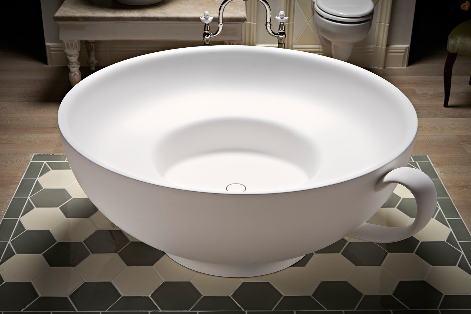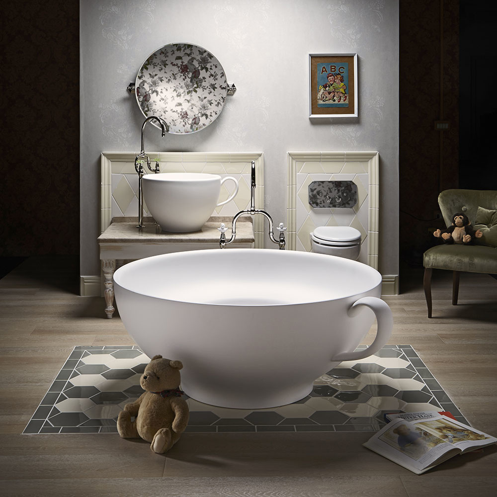 Des modèles décalés, où tout est réalisé sous forme de tasses - idéal pour une fille. Cependant, les produits ne diffèrent pas par leurs couleurs vives, l'accent est mis précisément sur la forme des appareils sanitaires.