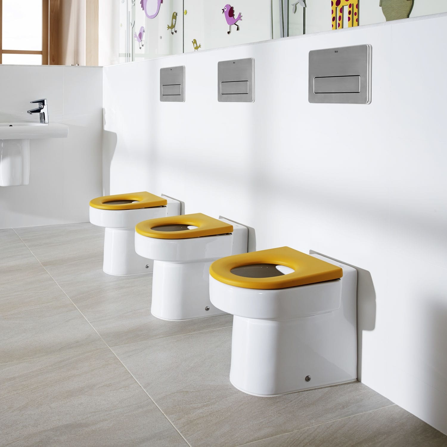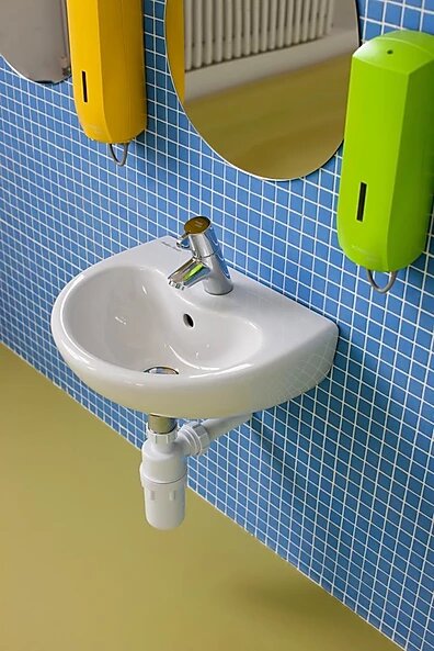 La plomberie est principalement destinée aux jardins d'enfants, puisque son point culminant est un bloc d'éviers avec un demi-piédestal. Il s'agit du premier produit en céramique sur le marché avec trois bols de différentes profondeurs placés sur tout le périmètre. Grâce à cette option, les enfants de tous âges peuvent utiliser l'évier, en choisissant intuitivement la hauteur la plus confortable pour se laver les mains ou se brosser les dents sans l'aide d'adultes.