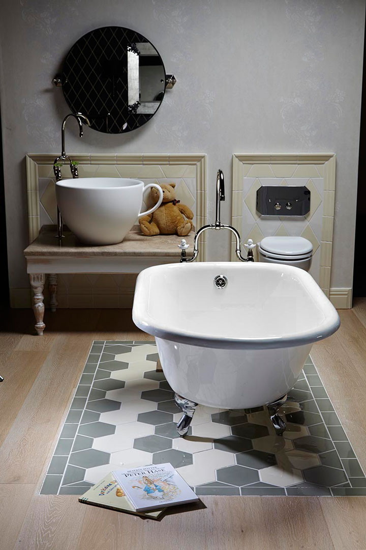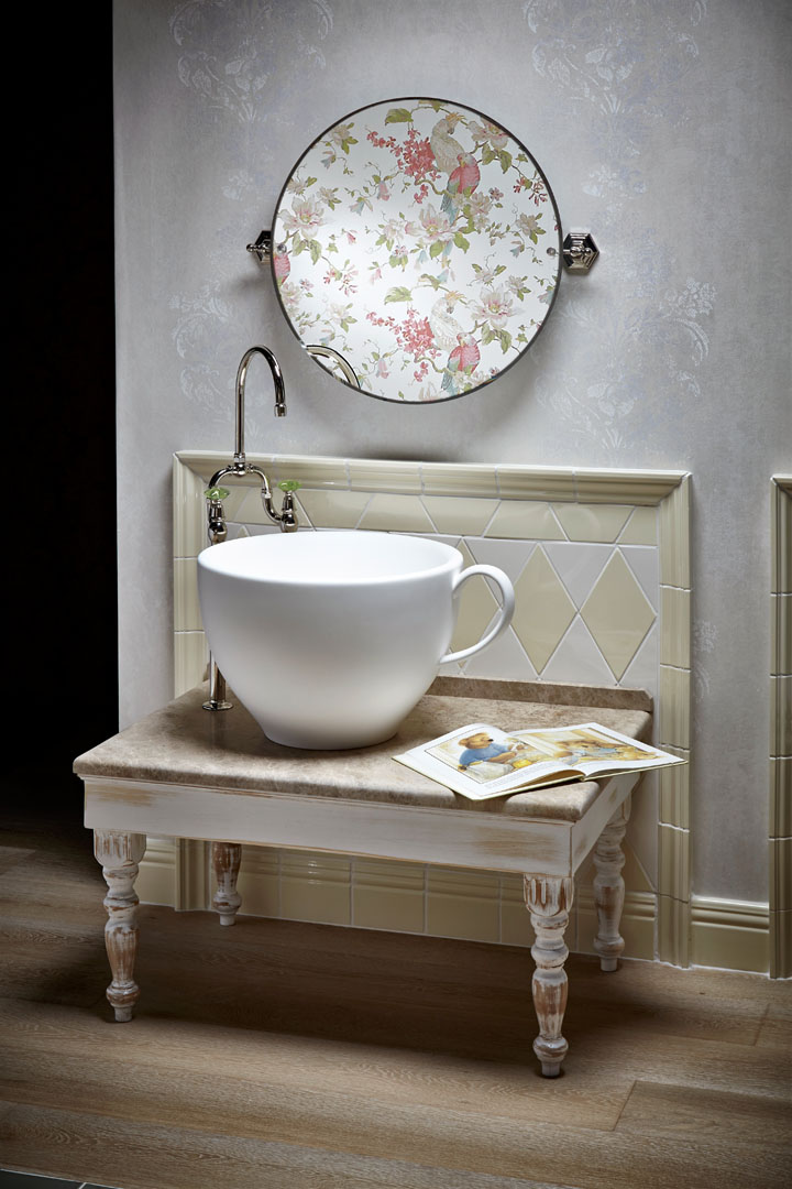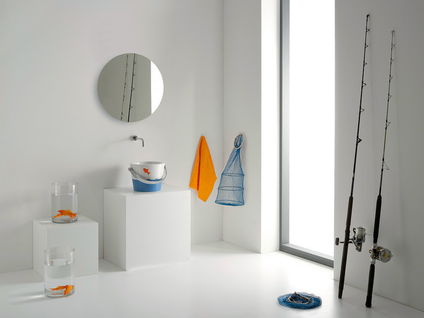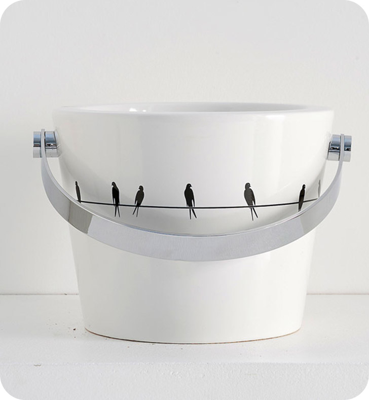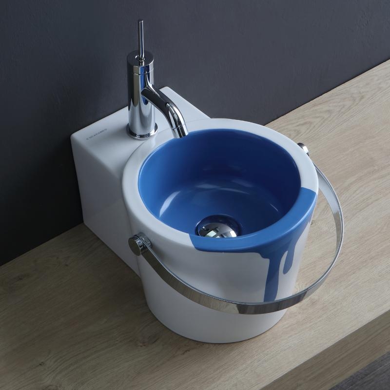 Une fois de plus, la pièce maîtresse est occupée par l’évier, conçu en forme de seau fantaisiste. Il peut être présenté en différentes tailles et couleurs, ils peuvent être soit entièrement blancs pour mettre en valeur les formes, soit lumineux, avec des motifs décoratifs. Par exemple, des poissons sautant hors de l’eau, des hirondelles ou de simples motifs géométriques. La poignée du seau fait office de porte-serviettes, aussi bien dans la version murale que dans la version à poser.
