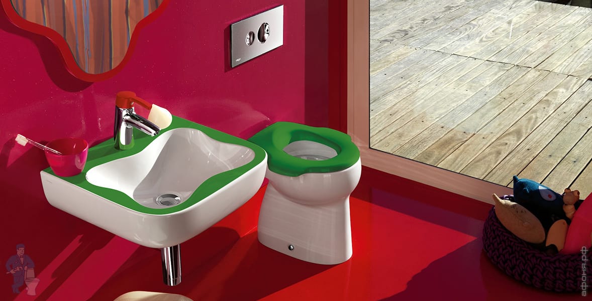 Les nuances des appareils sanitaires pour enfants peuvent être très différentes, mais la gamme principale, bien sûr, est lumineuse, accrocheuse et souvent tous les éléments sont multicolores. En gros, le même évier peut être peint de toutes les couleurs de l’arc-en-ciel.