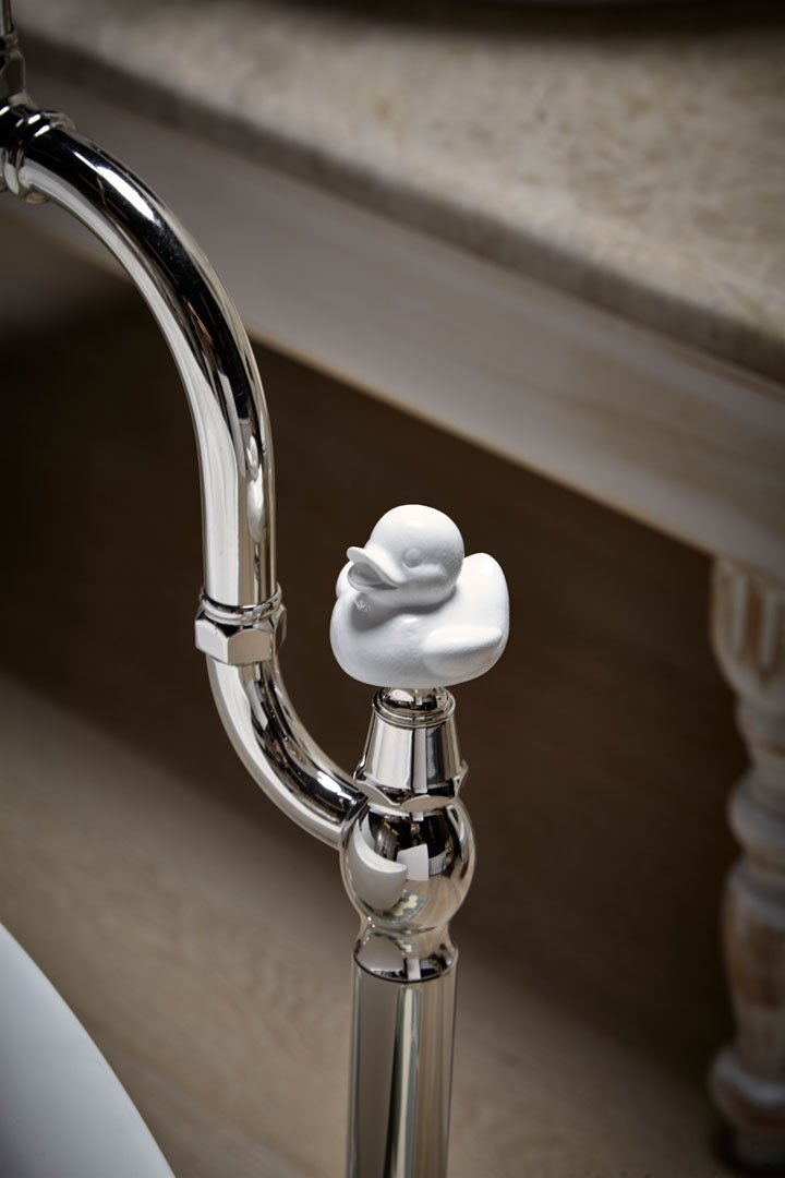 Les poignées de robinet peuvent ressembler à des fleurs en verre ou à de jolis canards en céramique. Tous les produits sont fabriqués à la main dans une usine en Italie, près de Florence.