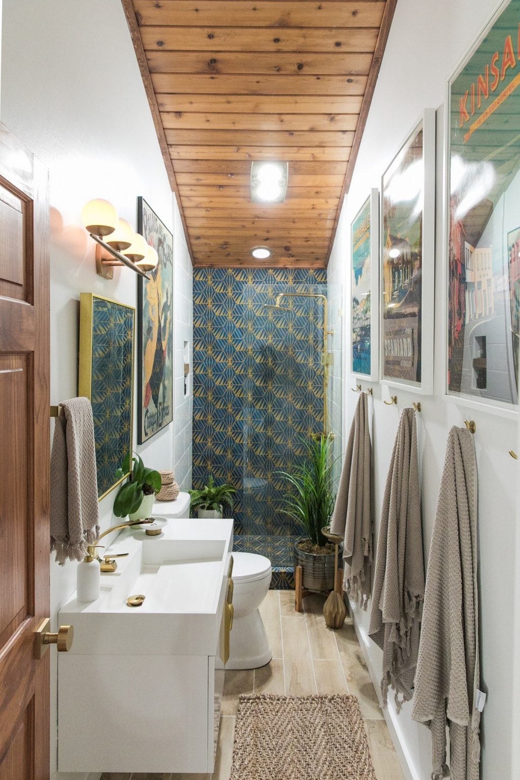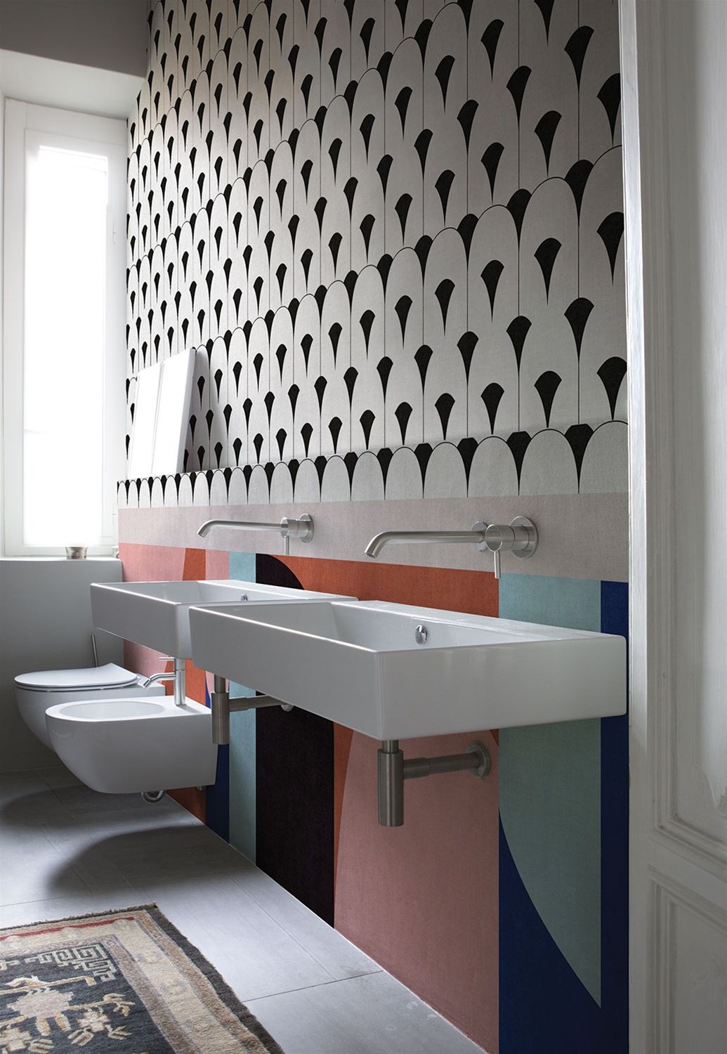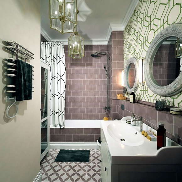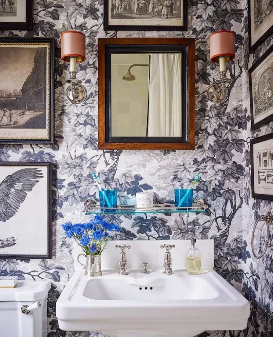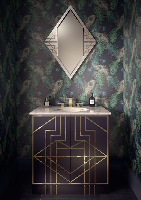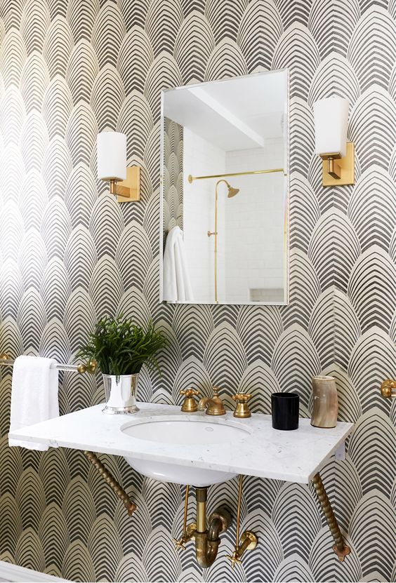 Si vous souhaitez quelque chose de plus attrayant et accrocheur, choisissez un papier peint avec un imprimé art déco, mais n'oubliez pas qu'il doit résister à l'humidité traditionnelle des salles de bains.