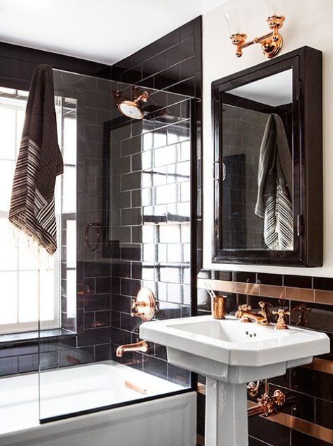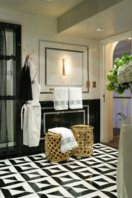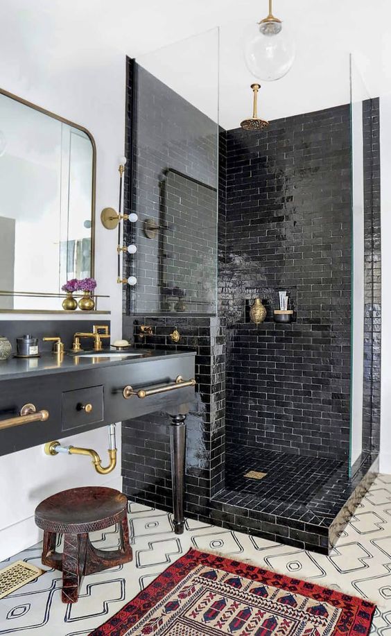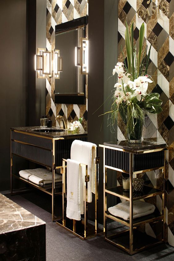 - Les carreaux brillants avec des détails et des éléments dorés sont chics et audacieux, parfaits pour un espace masculin.