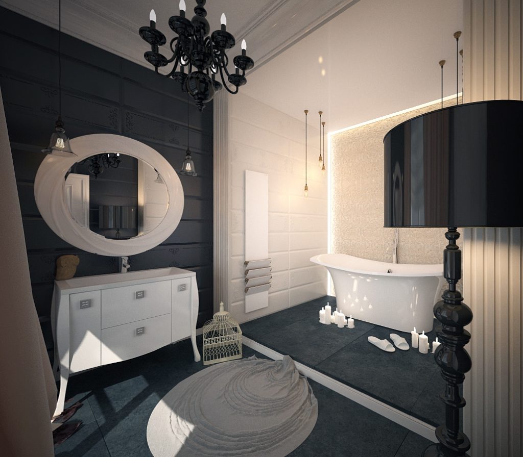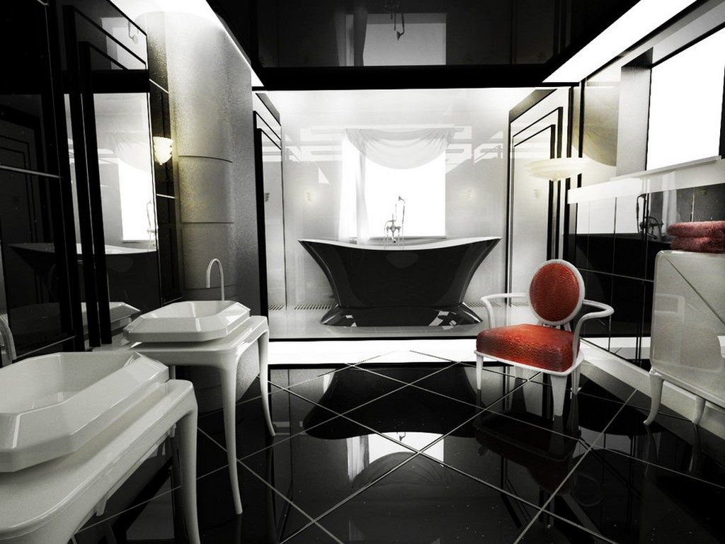 De nombreux meubles manquent, l'accent est mis sur les finitions et la plomberie. Ils accueillent favorablement les couleurs noir et blanc. Ici, vous pouvez également saisir avec succès des éléments originaux, par exemple :