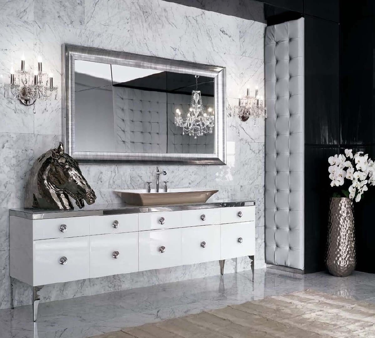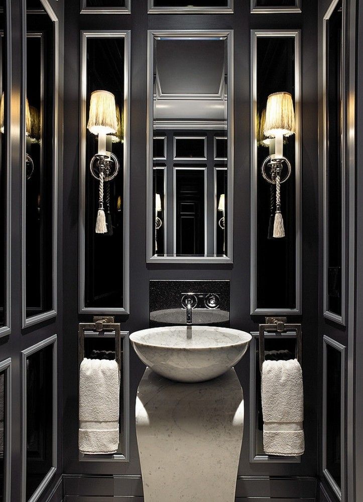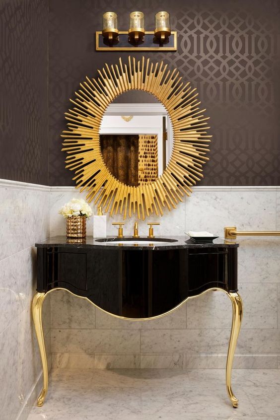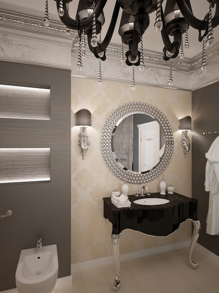 Un miroir dans la salle de bain est un élément incontournable. Il doit être grand, dans un cadre massif - argenté, doré ou simplement noir.