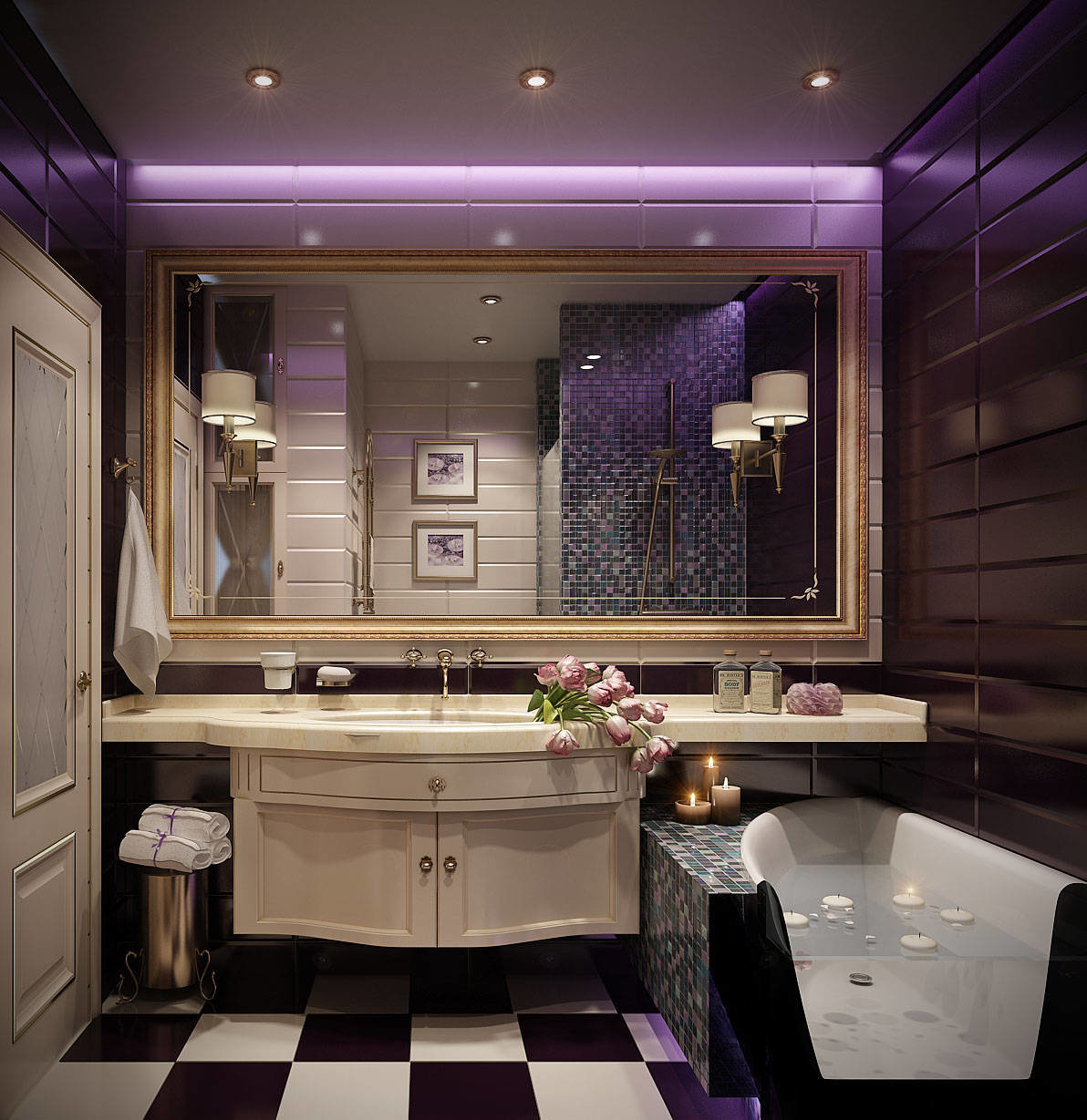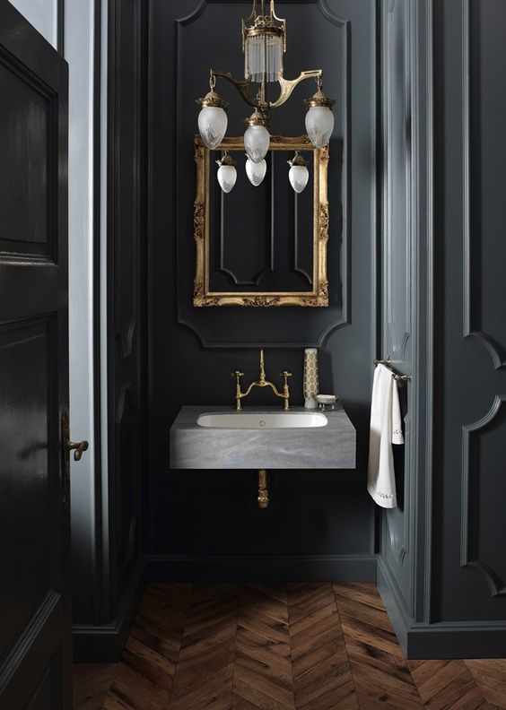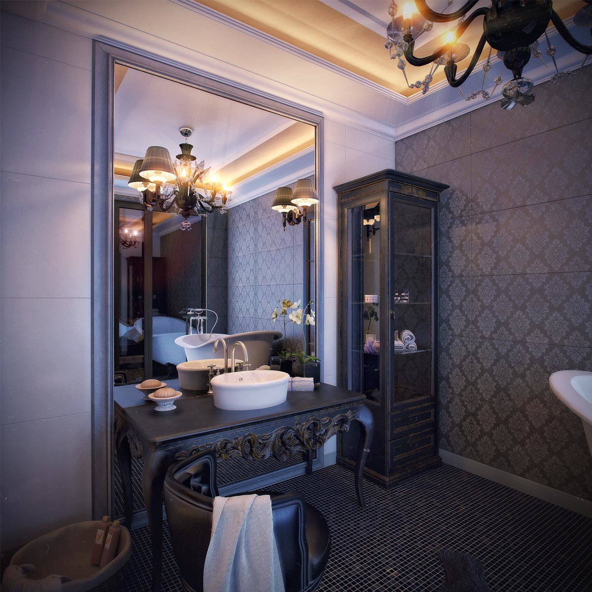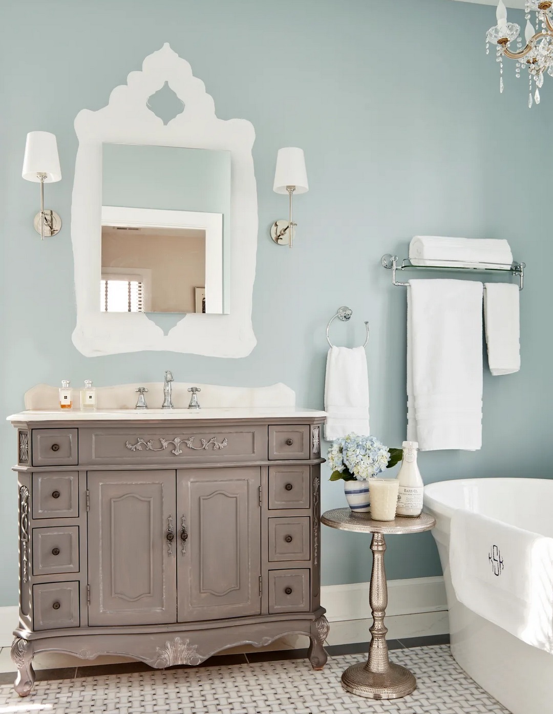 Un miroir dans la salle de bain est un élément incontournable. Il doit être grand, dans un cadre massif - argenté, doré ou simplement noir.