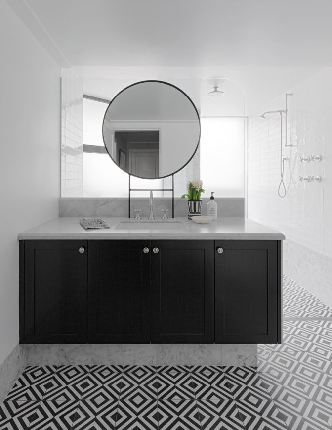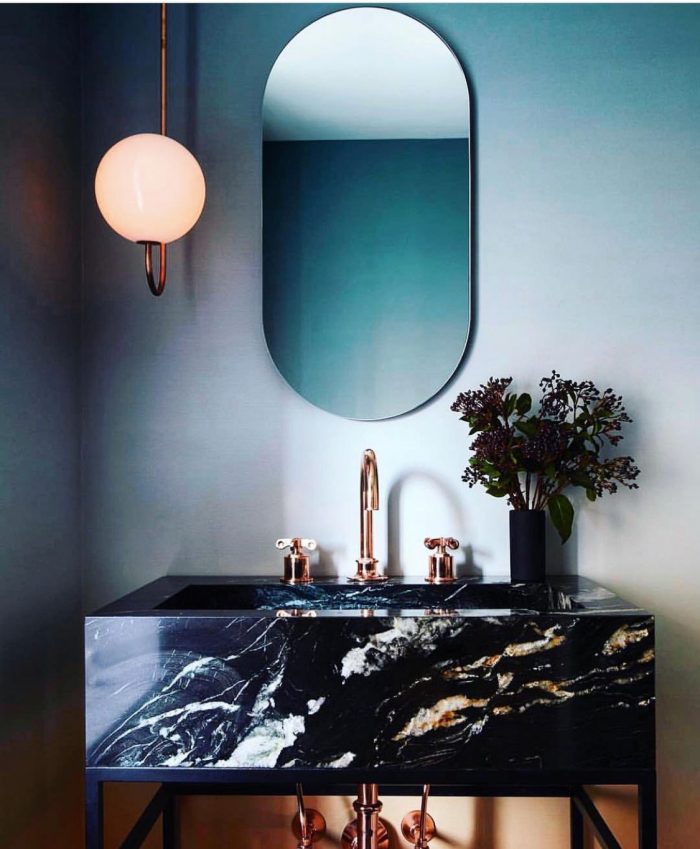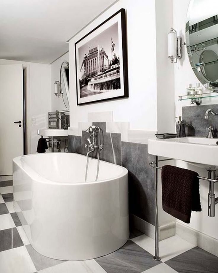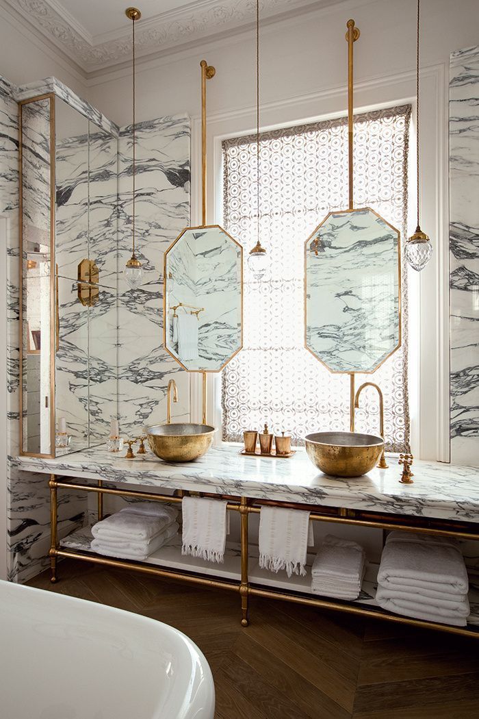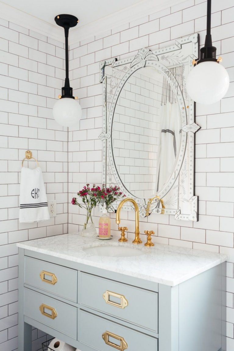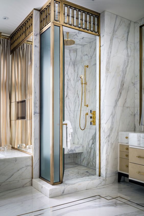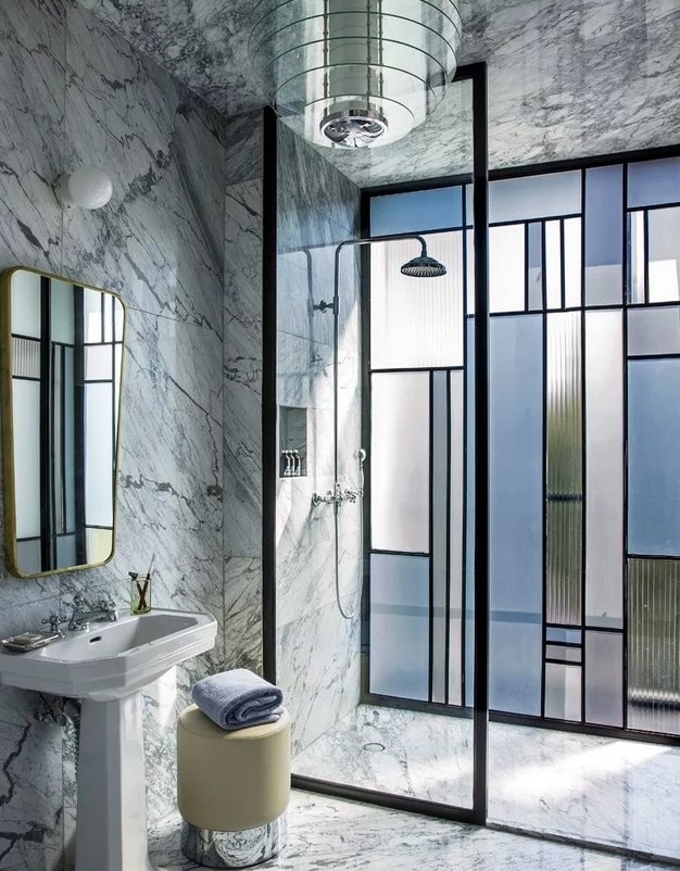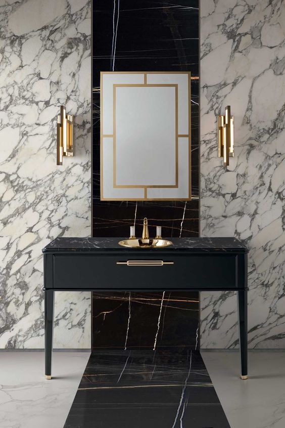 Le marbre est la meilleure option pour une salle de bains de style art déco. La pièce sera tout aussi élégante avec n'importe quel marbre - blanc, gris ou noir - au sol et sur les murs. Quant aux carreaux, choisissez ceux avec une surface brillante : noir, blanc, bleu, émeraude ou toute autre couleur que vous aimez.