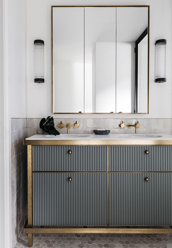 Les salles de bains Art Déco en sont un bon exemple. Ce sont des nuances calmes et douces des murs, des objets de décoration exquis, des meubles luxueux et des accents lumineux sous la forme d'ornements inhabituels.