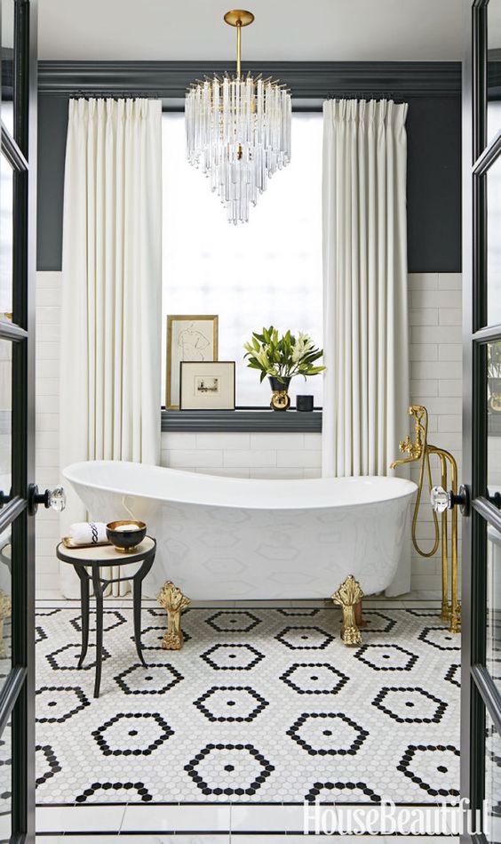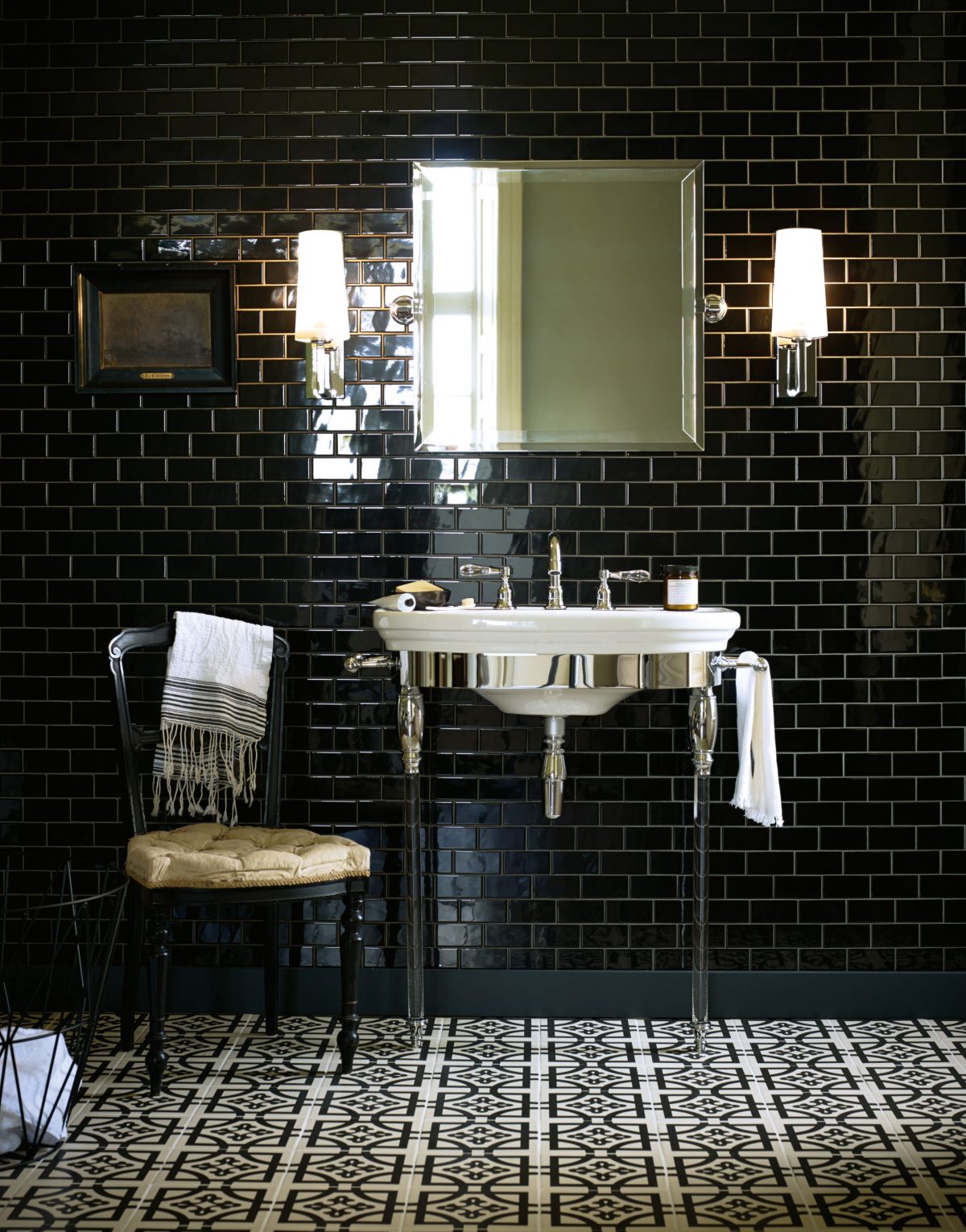 Le noir et le blanc sont le choix le plus populaire pour les intérieurs Art déco, et créer différents motifs géométriques avec eux est une idée chic. Les carreaux métro (imitation brique) sont également les bienvenus, ils sont très impressionnants et en même temps leur prix est tout à fait abordable. De plus, cette finition est très appréciée actuellement.
