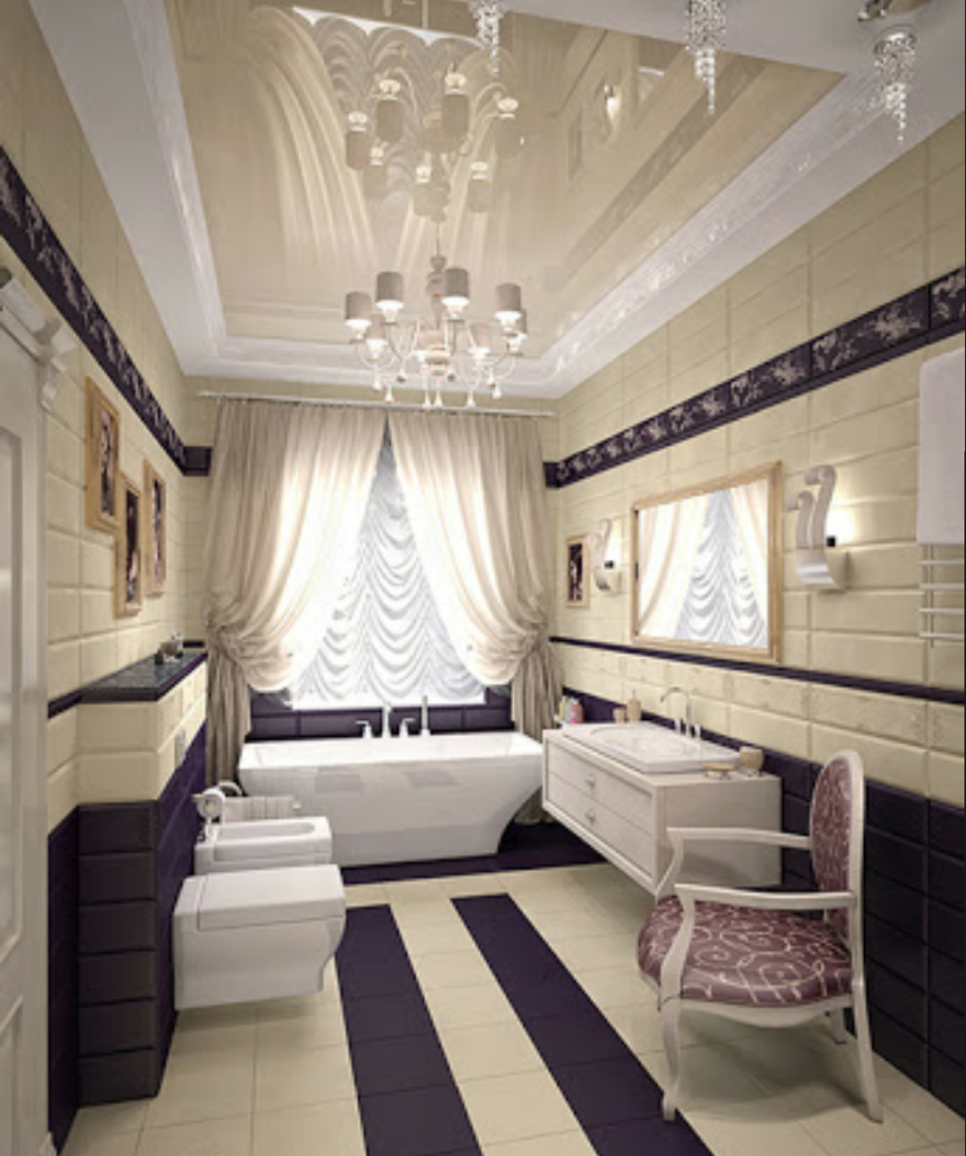 Si la salle de bain a une fenêtre, les rideaux font partie intégrante de cette direction. Ils doivent être massifs et lourds. Les attaches et les superpositions sont encouragées. Différentes nuances sont acceptables - vous pouvez utiliser des tissus unis qui mettent en valeur la palette de couleurs globale de la pièce, ou laisser libre cours à votre imagination et acheter des rideaux avec des motifs lumineux ou de grands motifs géométriques.