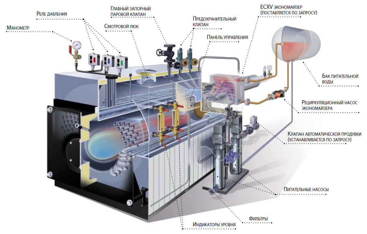 - Tout d’abord, l’eau doit être purifiée. Cela se produit à l'aide d'une pompe électrique. Le liquide est d'abord envoyé vers un réservoir situé en haut de la chaudière.