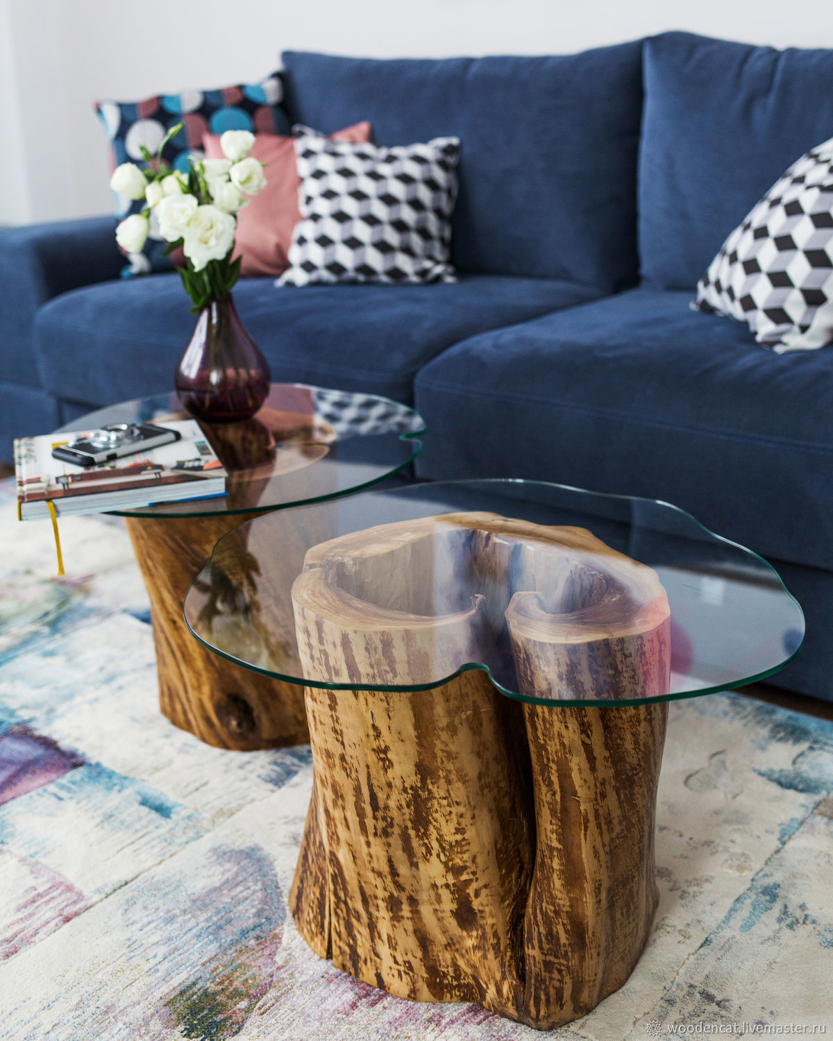 Les amateurs d'éco-style adoreront l'idée de remplacer la table basse par des bûches ordinaires ou une coupe d'un vieil arbre. Cette solution semble avantageuse dans n'importe quel intérieur. Le bois peut être laissé non traité ou peint avec du vernis pour une couleur riche et une texture prononcée.