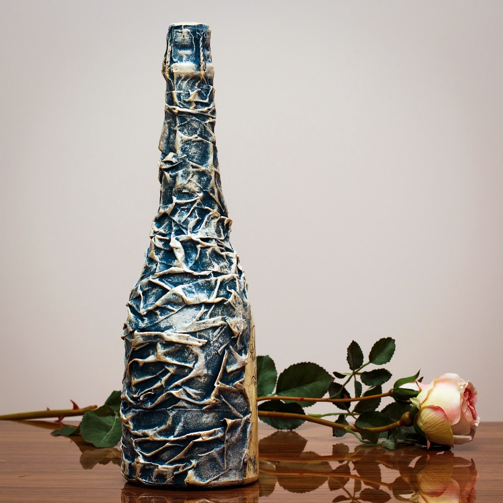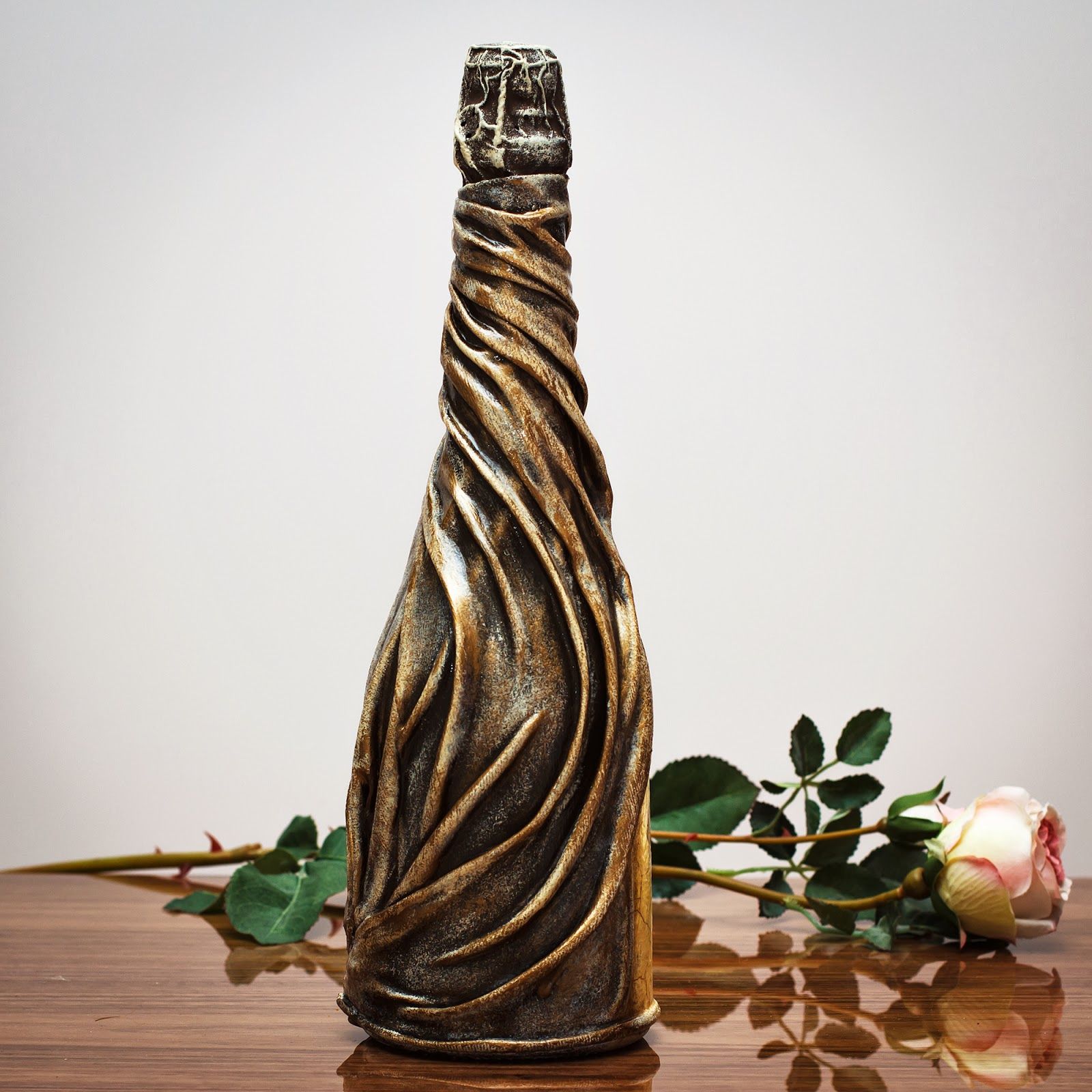 Avant d'être collé sur le flacon, le tissu est soigneusement imprégné de la composition et, sans attendre le séchage, est réparti sur la surface. Formez immédiatement votre composition.Après durcissement, vous pouvez le recouvrir de peintures acryliques, de paillettes, de morceaux de papier d'aluminium et fixer le résultat avec du vernis.