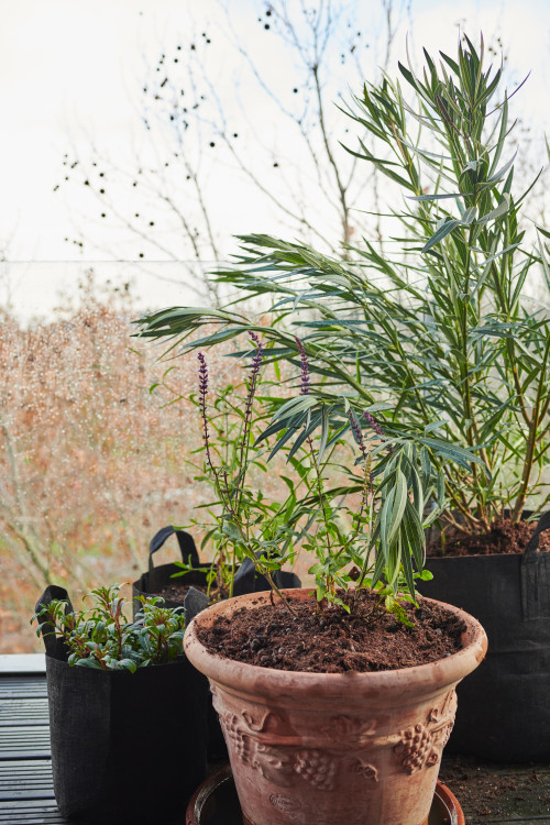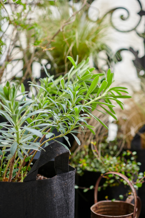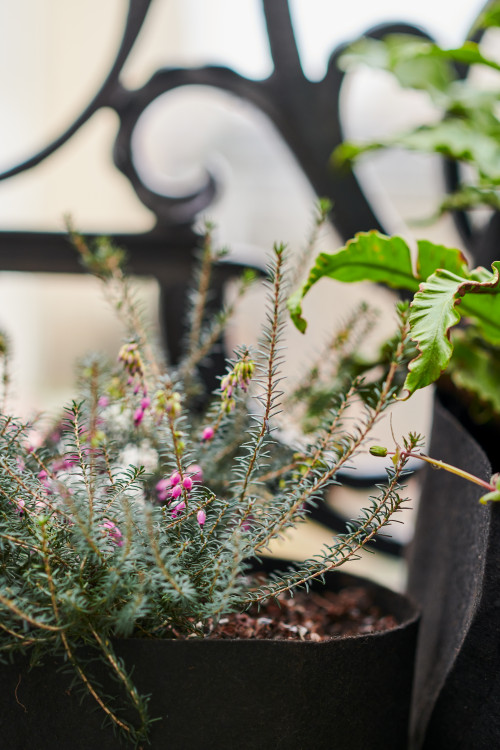 L’idée était simple : les pots étaient disposés de manière à pouvoir profiter d’une floraison durable tout au long de la saison chaude. Ainsi, des plantes ont été sélectionnées qui tolèrent bien la mi-ombre et prospèrent au soleil. Ils présentaient des roses, de la lavande, du romarin, des clématites, du cyprès, du liseron, du jasmin, des jacinthes, de la verveine, de la glycine et, pour l'ombre, des hortensias, des géraniums, des carex et quelques autres.