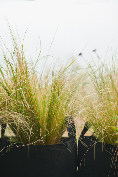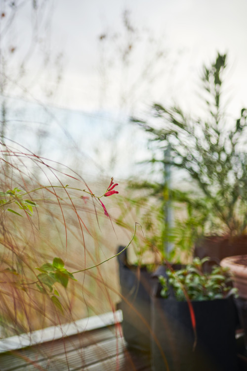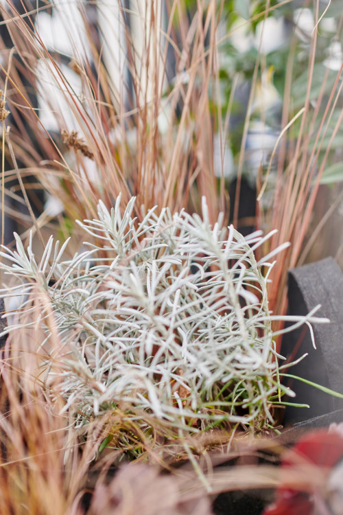 Les plantes plantées sur ce balcon tolèrent bien la sécheresse et le vent, mais nécessitent en même temps de longues heures de clarté. Par conséquent, dans ce projet, les personnages principaux étaient l'herbe à plumes, le tamaris, l'arbousier, la verveine, l'absinthe, l'armeria, le tournesol et d'autres beaux plants.