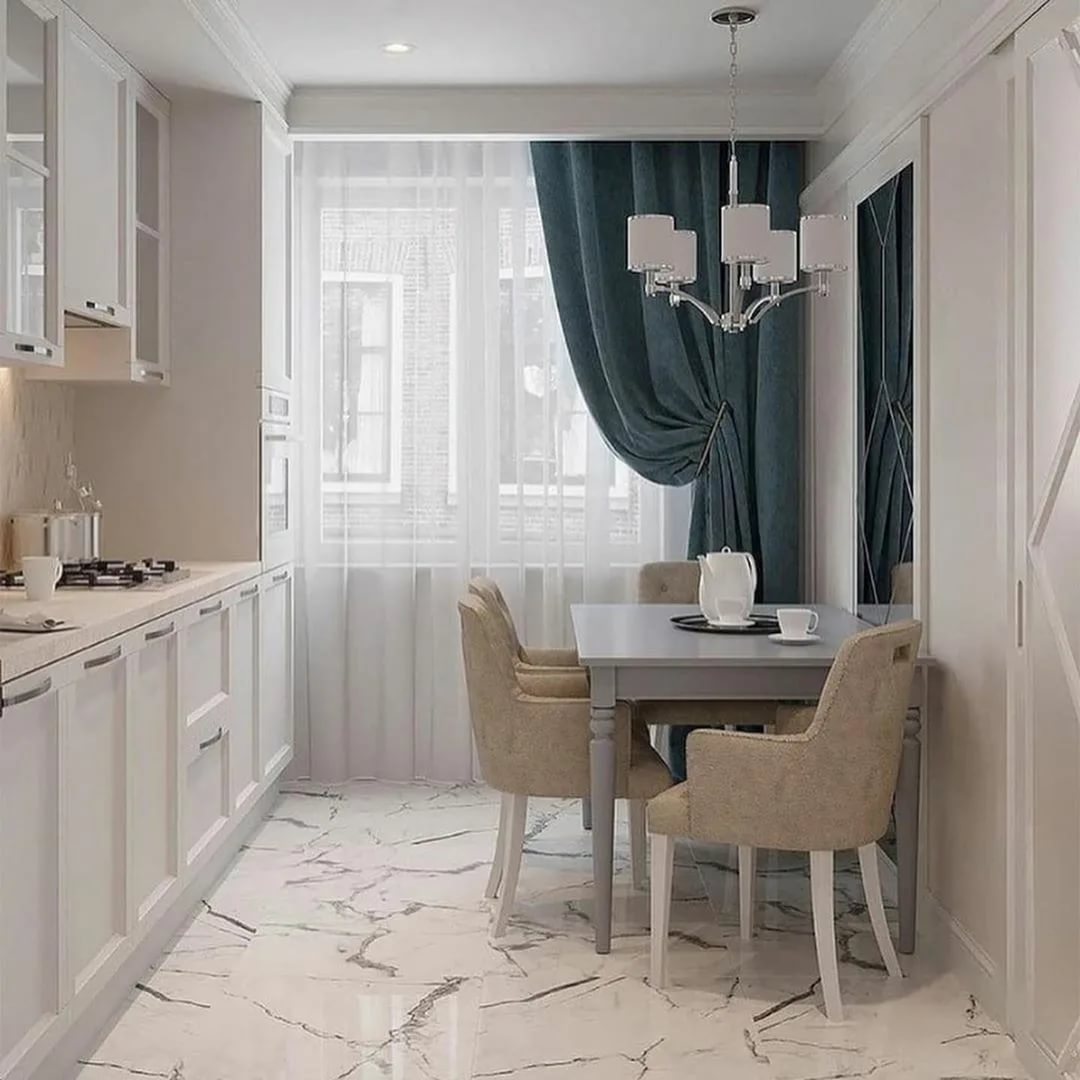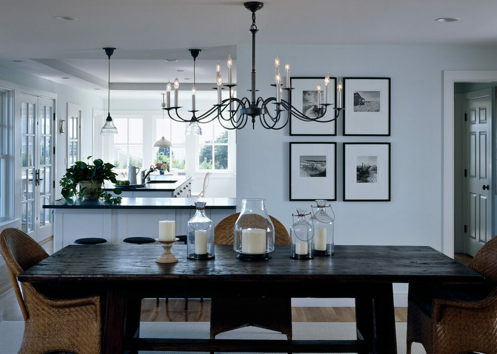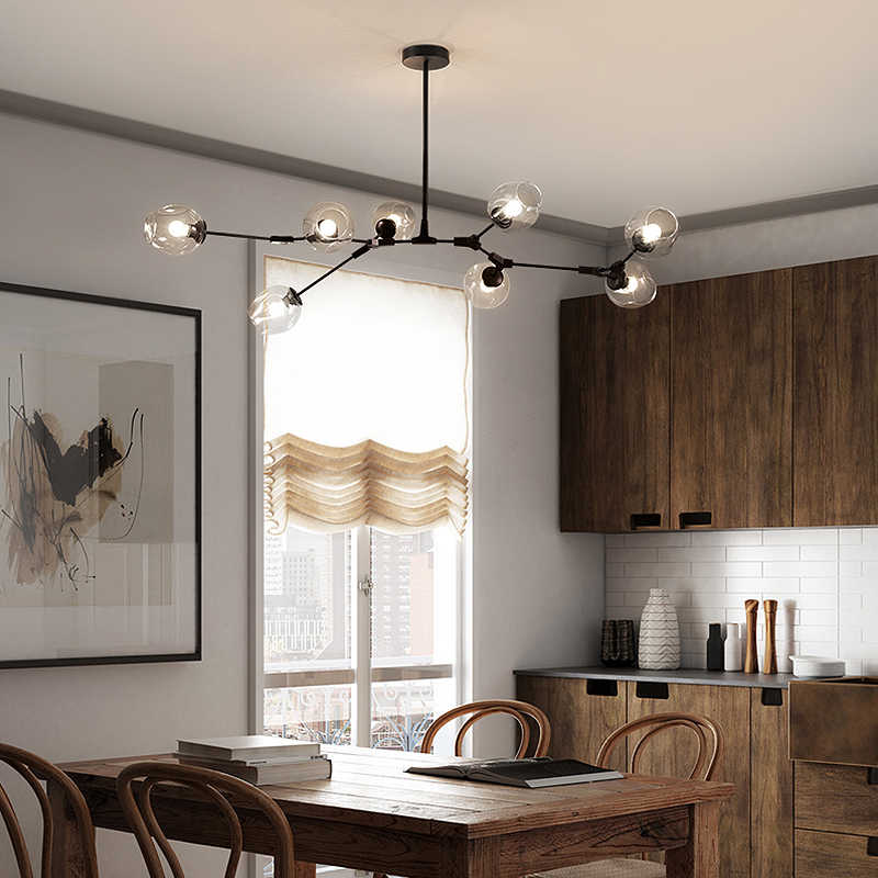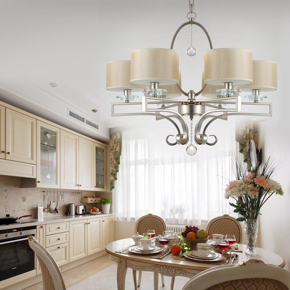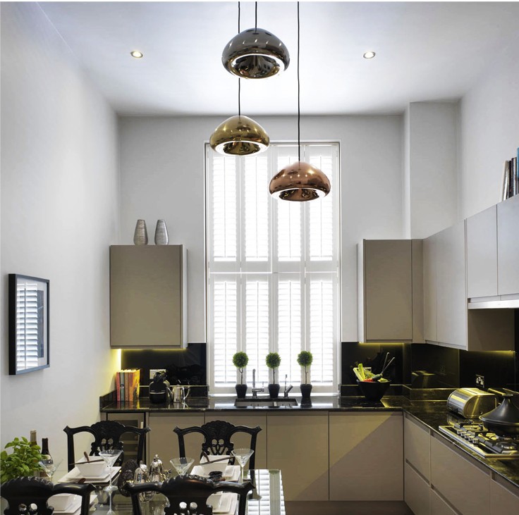 La taille de la pièce et sa forme influenceront le choix du lustre. Si la pièce est étroite, placer le luminaire au milieu entraînera une obscurité dans les coins. Pour une telle pièce, il est plus rationnel d’utiliser des sources lumineuses appariées.Pour une grande cuisine, un seul lustre peut ne pas suffire.