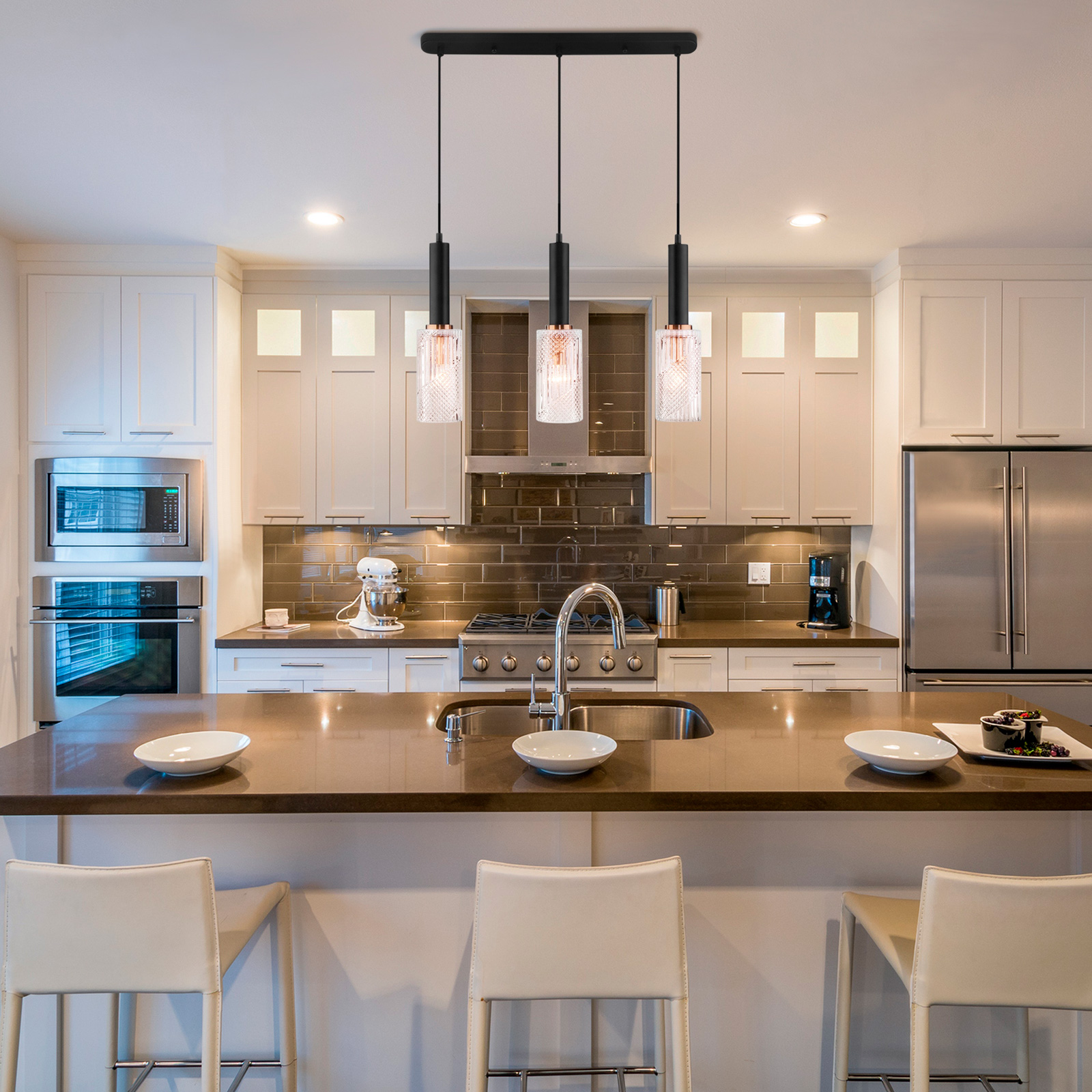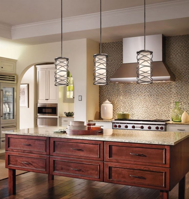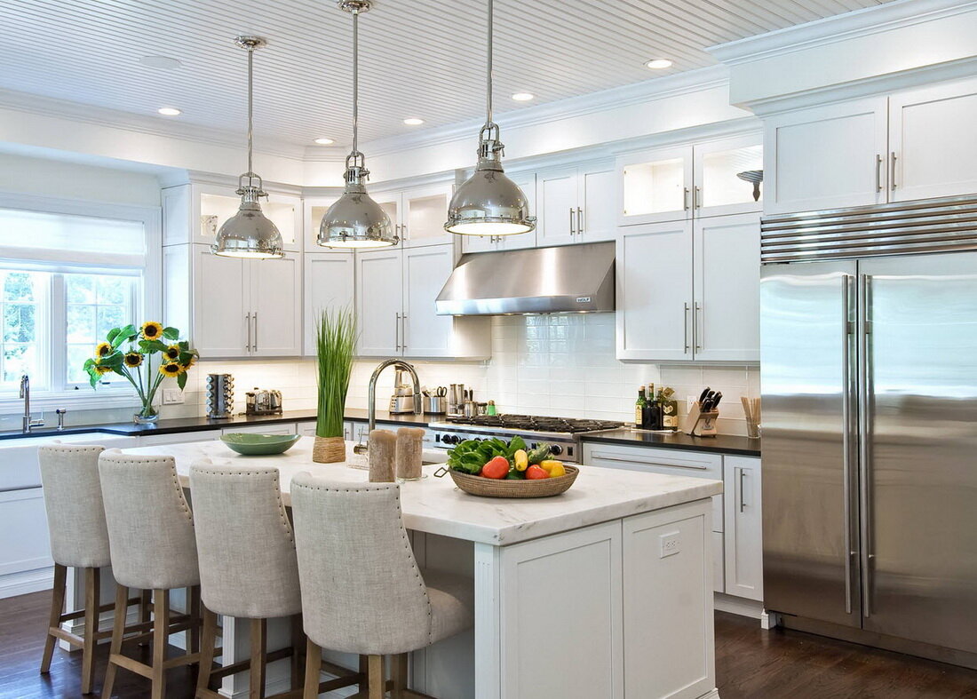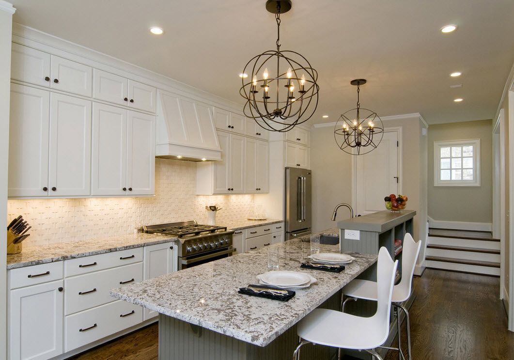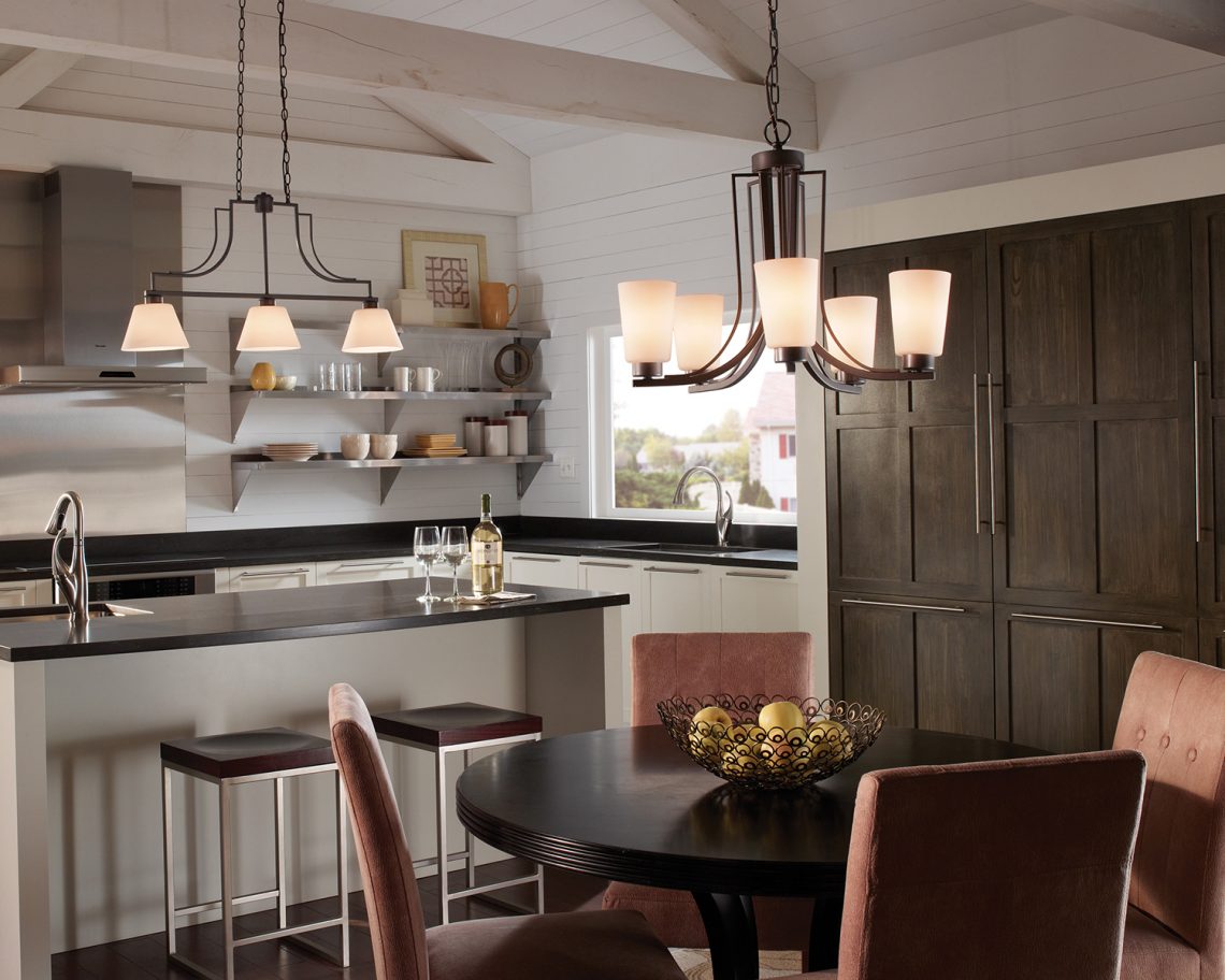 Conseil! Si une péninsule ou un îlot est installé dans la cuisine, alors le lustre est placé au-dessus. Pour le reste de l'espace, un éclairage local est adapté. Dans ce cas, le produit est suspendu de manière à ce qu'il se trouve à au moins 70 cm au-dessus du plateau.