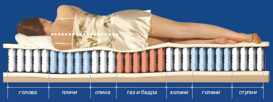 Les conceptions constituées de ressorts librement situés ne présentent pas ces inconvénients. Chacun est installé dans une mallette en tissu et prend une charge individuelle. En général, le produit s'adapte parfaitement aux contours de n'importe quel corps, a une rigidité variable sur la longueur (jusqu'à 9 zones), tandis que les plus complexes appartiennent à la catégorie de prix moyen.