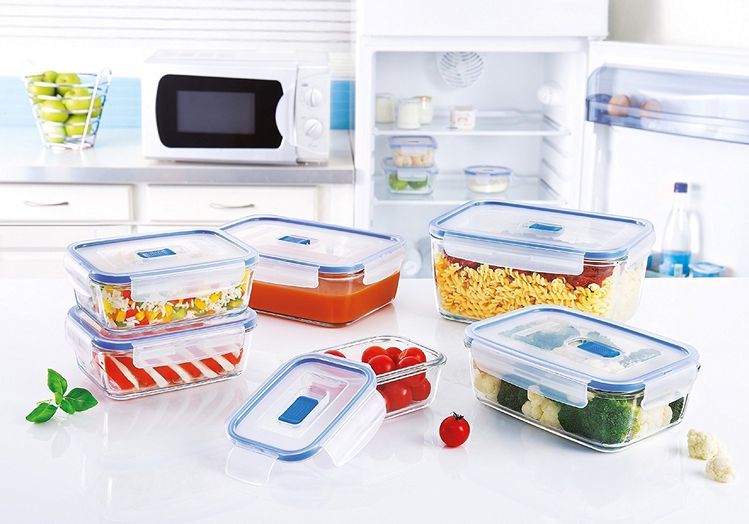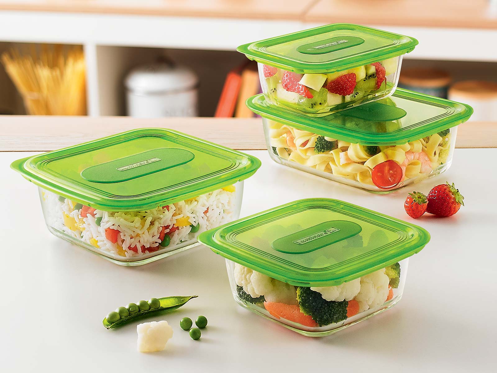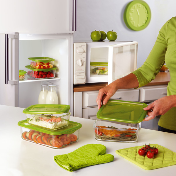Le matériau de fabrication est du verre borosilicaté, les couvercles sont en plastique. En outre équipé d'une vanne d'évacuation de la vapeur. Les plats peuvent résister à une chaleur jusqu'à 400 degrés et peuvent être utilisés comme plat de cuisson. Il peut également être utilisé au réfrigérateur/congélateur, au four à micro-ondes.