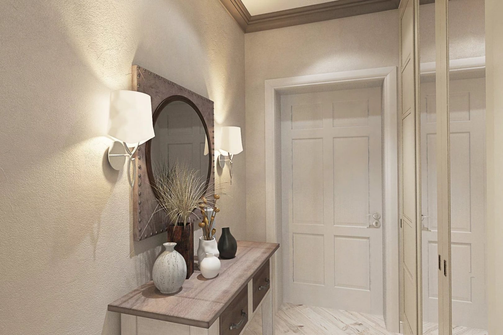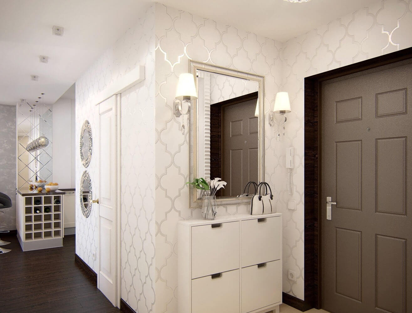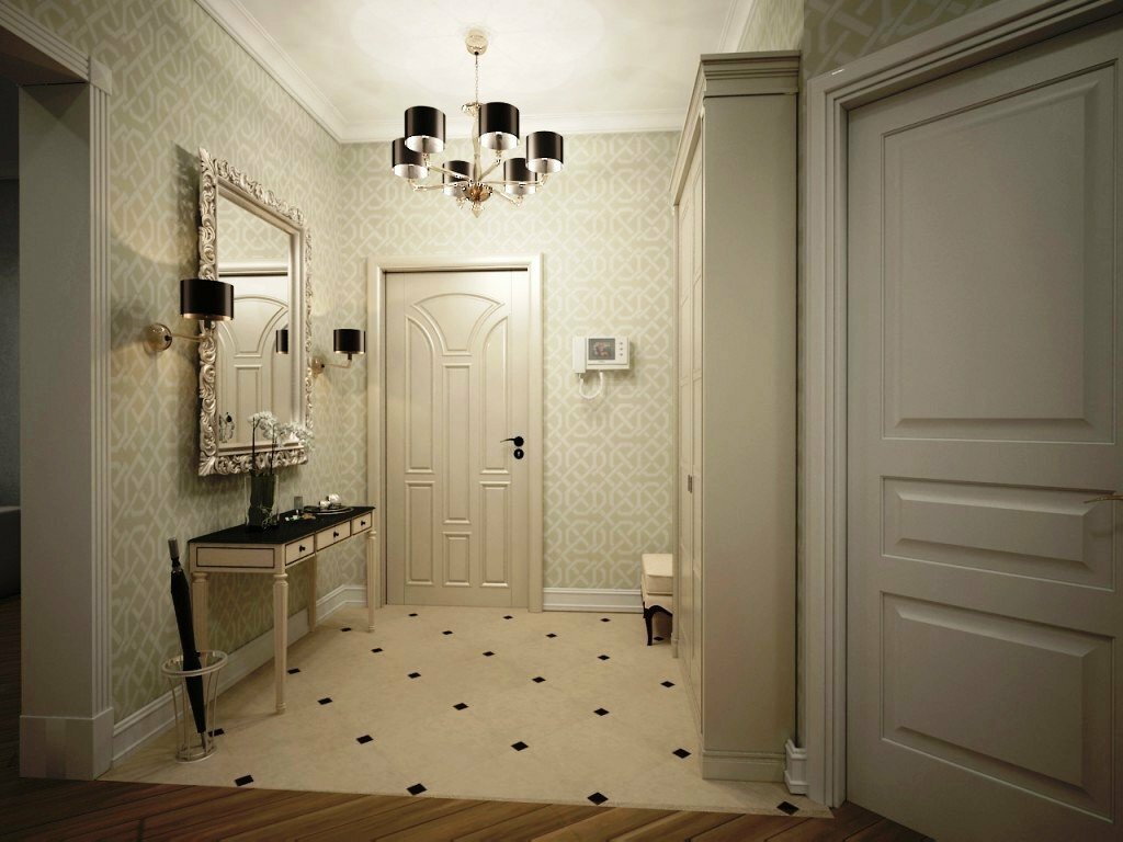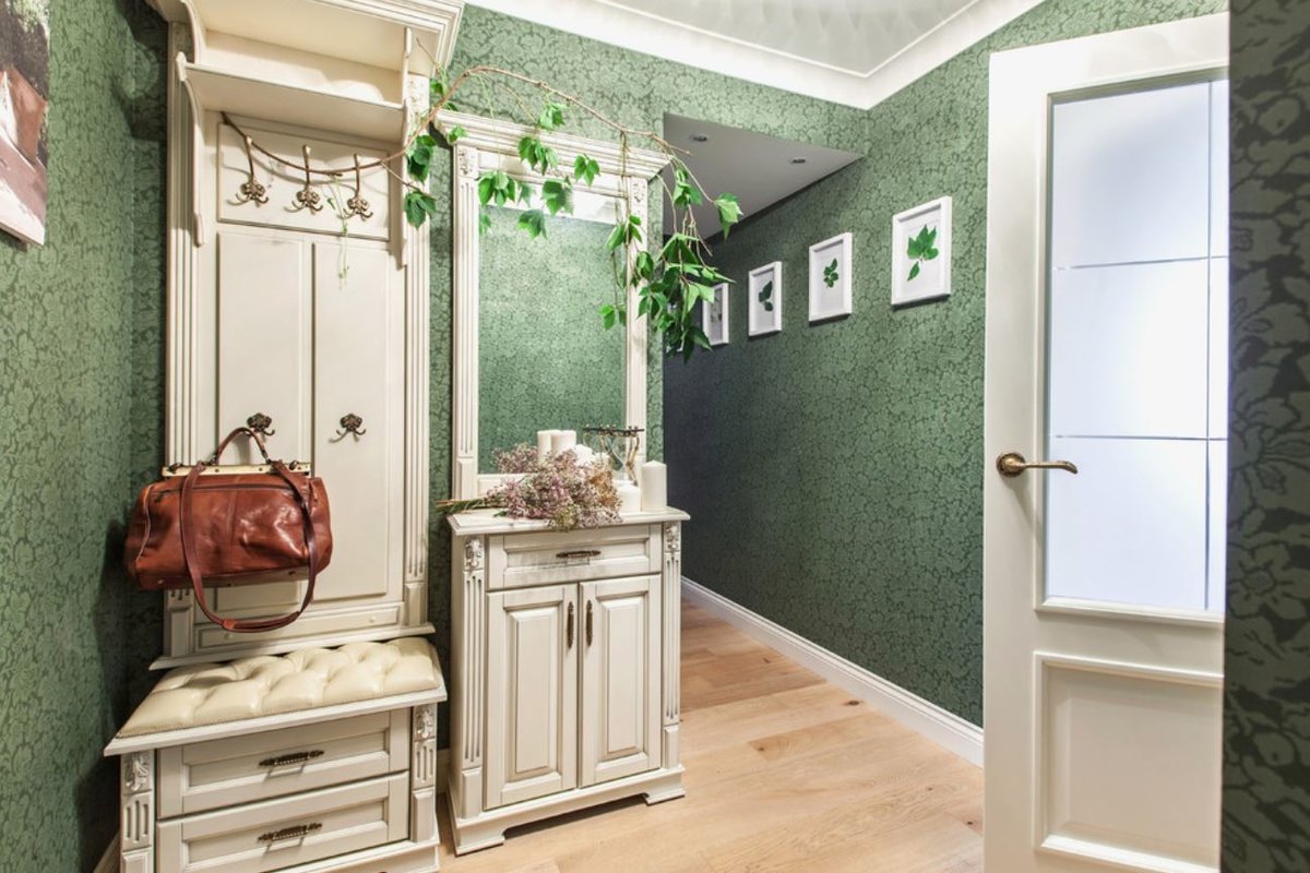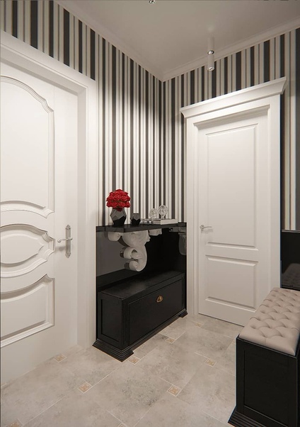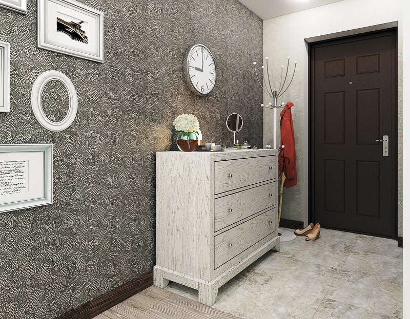La plupart d’entre nous pensent que les accents ne sont pas nécessaires dans le couloir, mais ce n’est pas tout à fait vrai. Naturellement, il vaut mieux refuser certains dessins de grande envergure, car il n'y a tout simplement pas assez d'échelle pour eux, mais les petits motifs fonctionneront très bien. Il peut s’agir de motifs géométriques, de motifs végétaux ou floraux. Il est important qu’ils ne soient pas pompeux et à grande échelle.